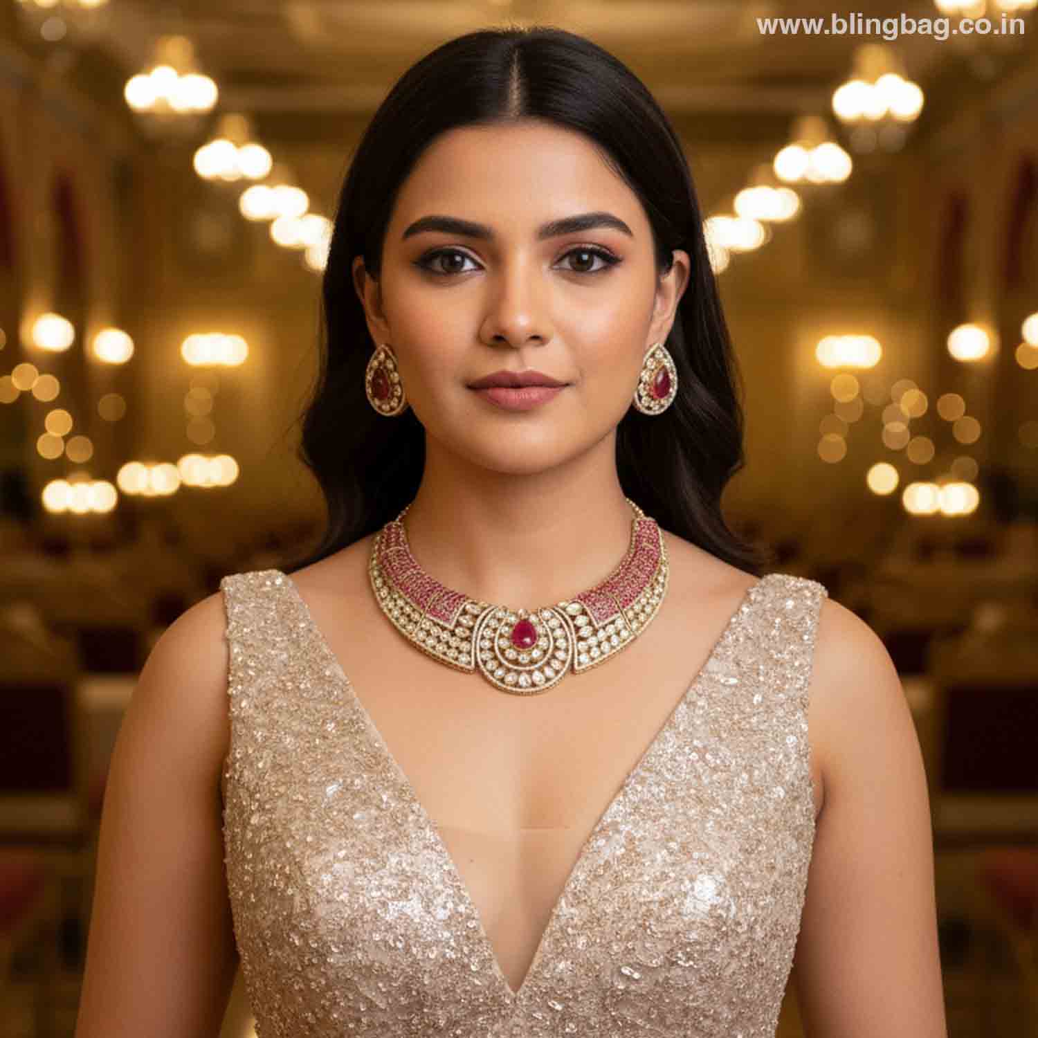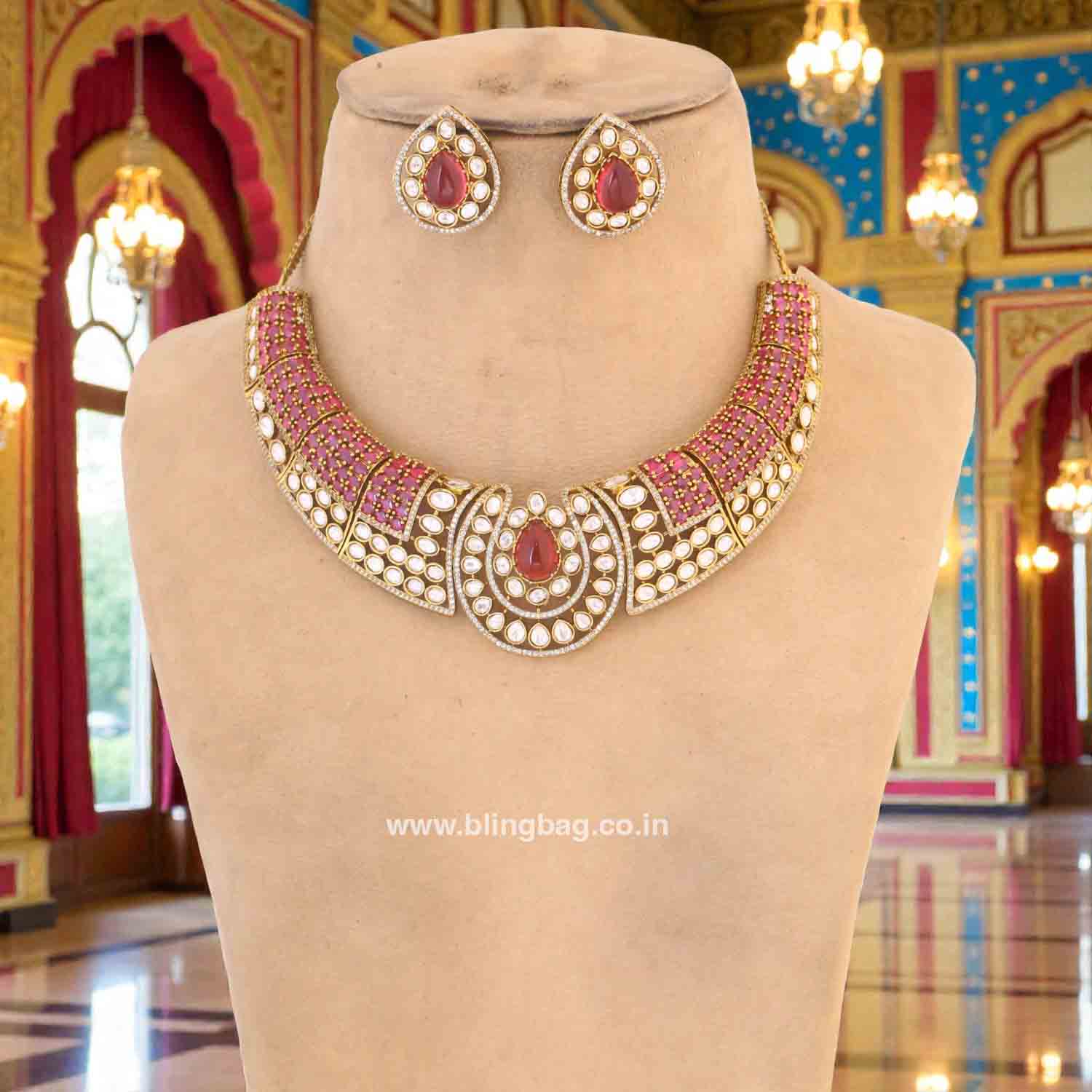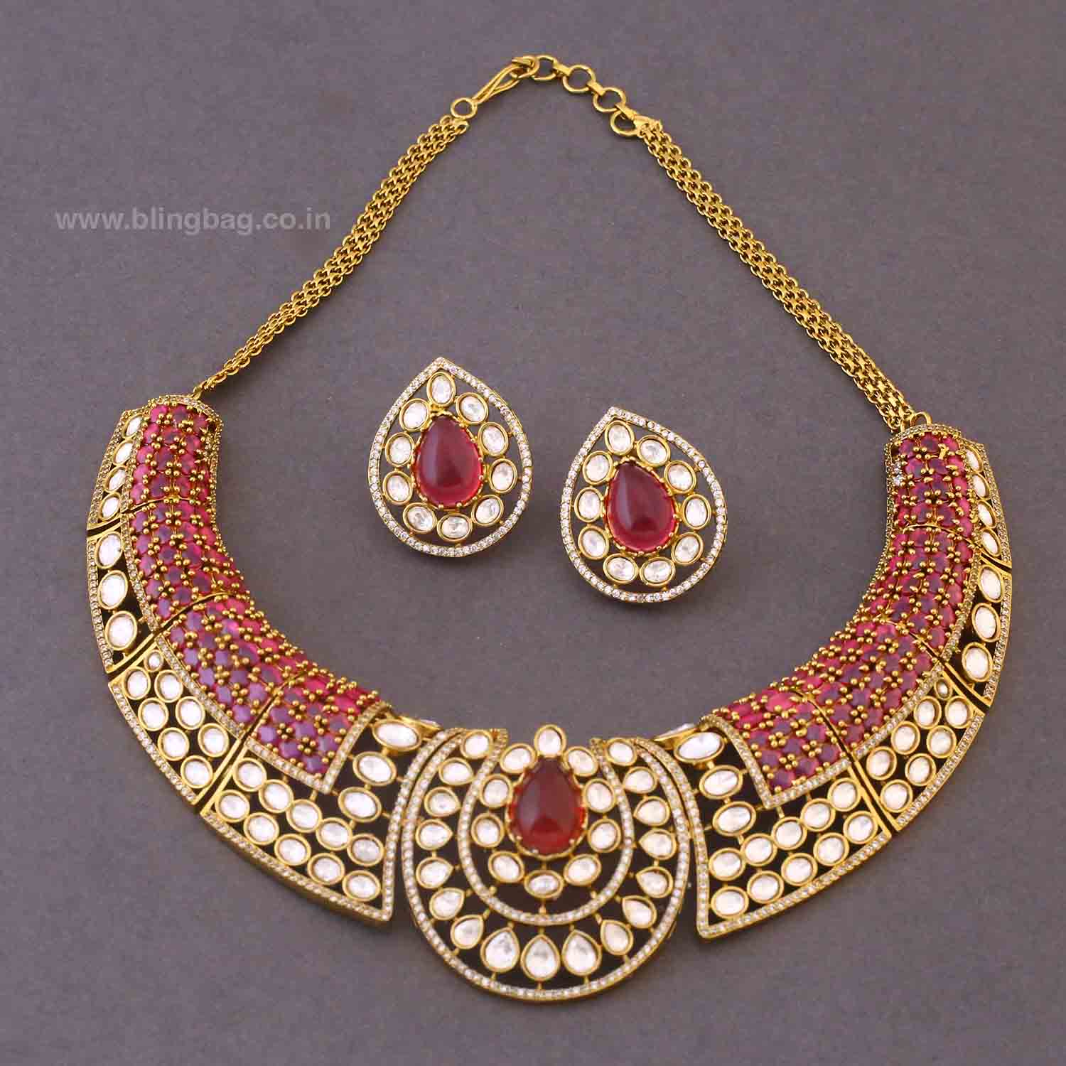 This luxurious Victorian-style hasli jewellery set showcases a bold gold-tone necklace adorned with deep ruby-red center stones, sparkling kundan accents, and intricate handcrafted detailing. Paired with matching teardrop earrings, it delivers a rich and timeless royal appeal.