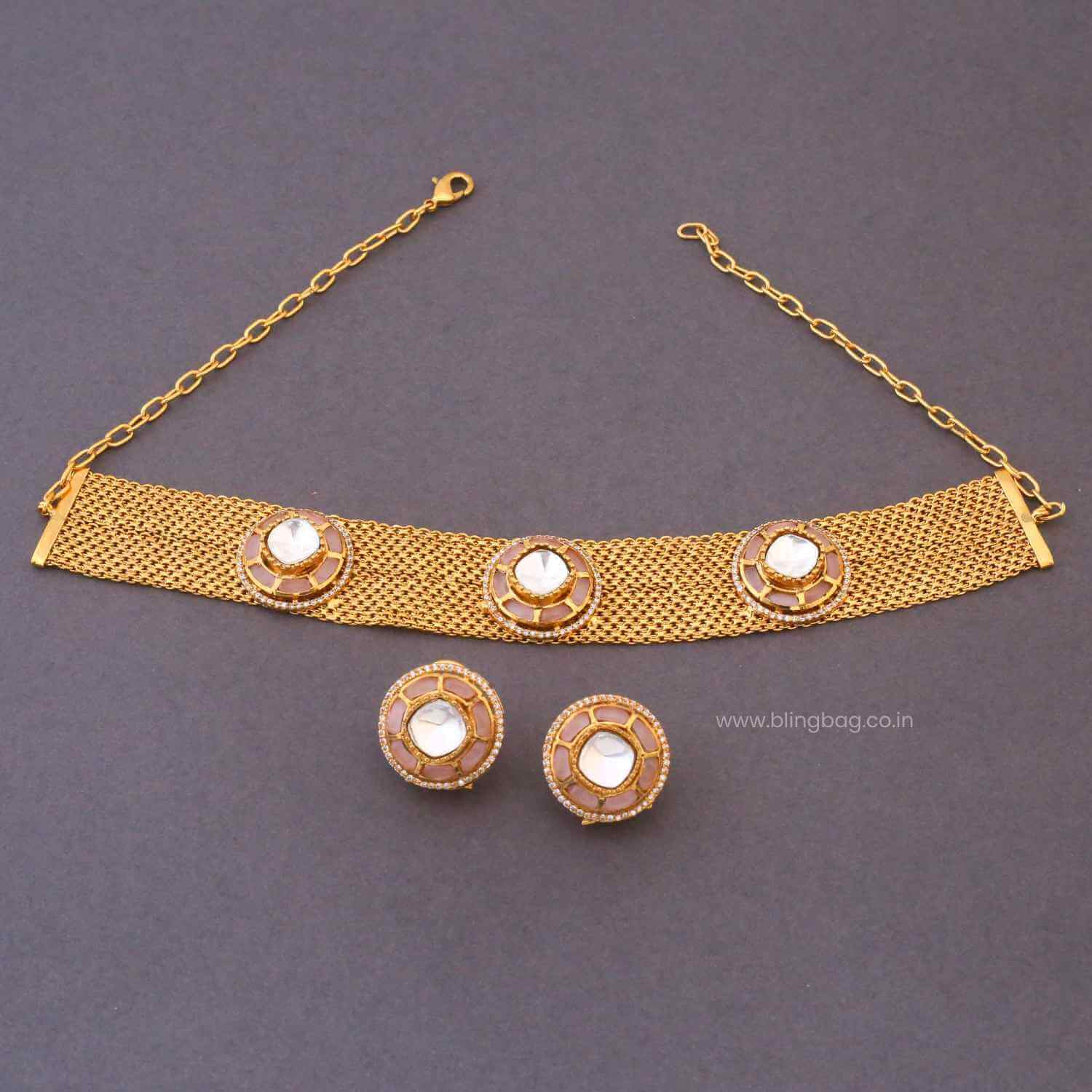 This elegant jewelry set features a sleek choker-style design with a finely textured band, highlighted by round stone accents placed at equal intervals. The matching studs mirror the same circular pattern, creating a coordinated and polished look that feels refined yet versatile.