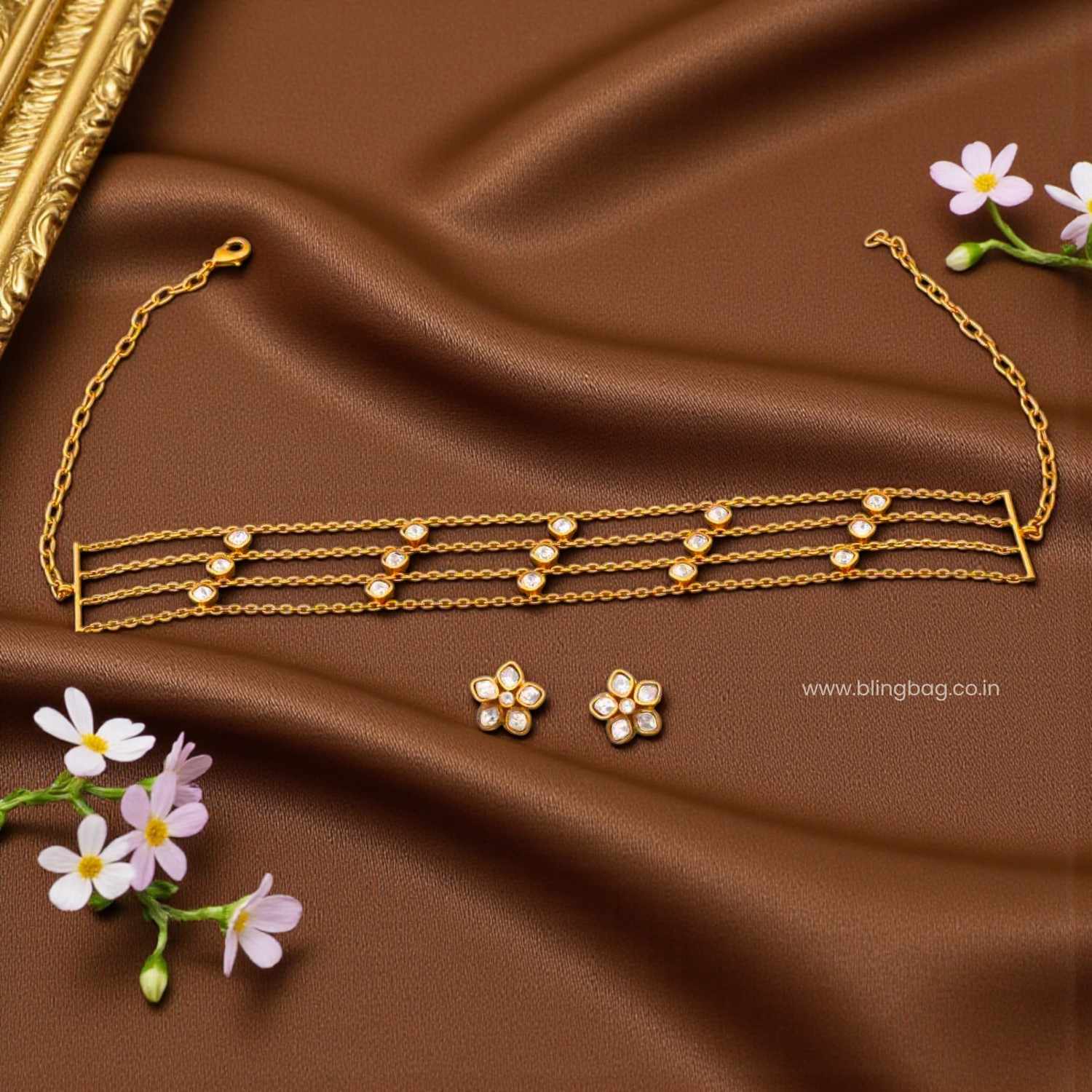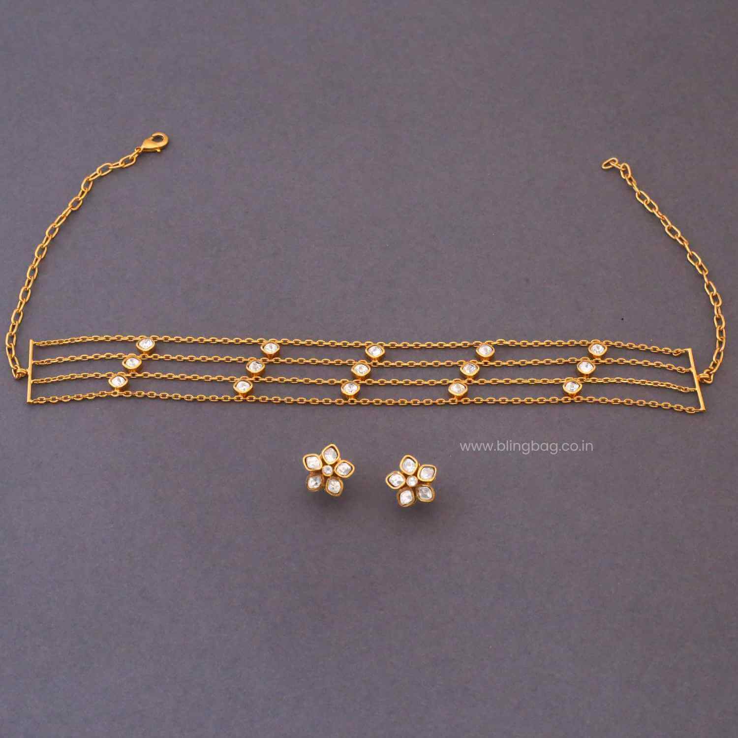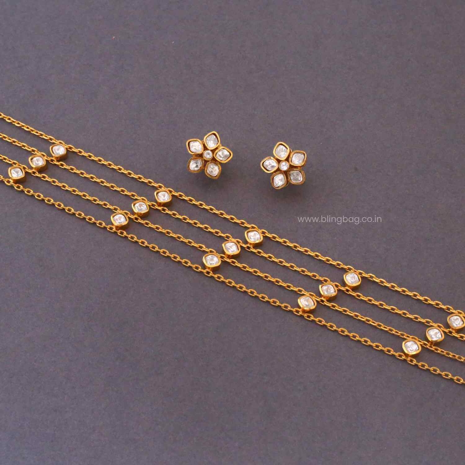 This elegant chain set features fine layered links accented with evenly placed sparkling stone details. The coordinated flower-shaped studs add a subtle charm, making the design lightweight, graceful, and perfect for everyday elegance or minimal festive styling.