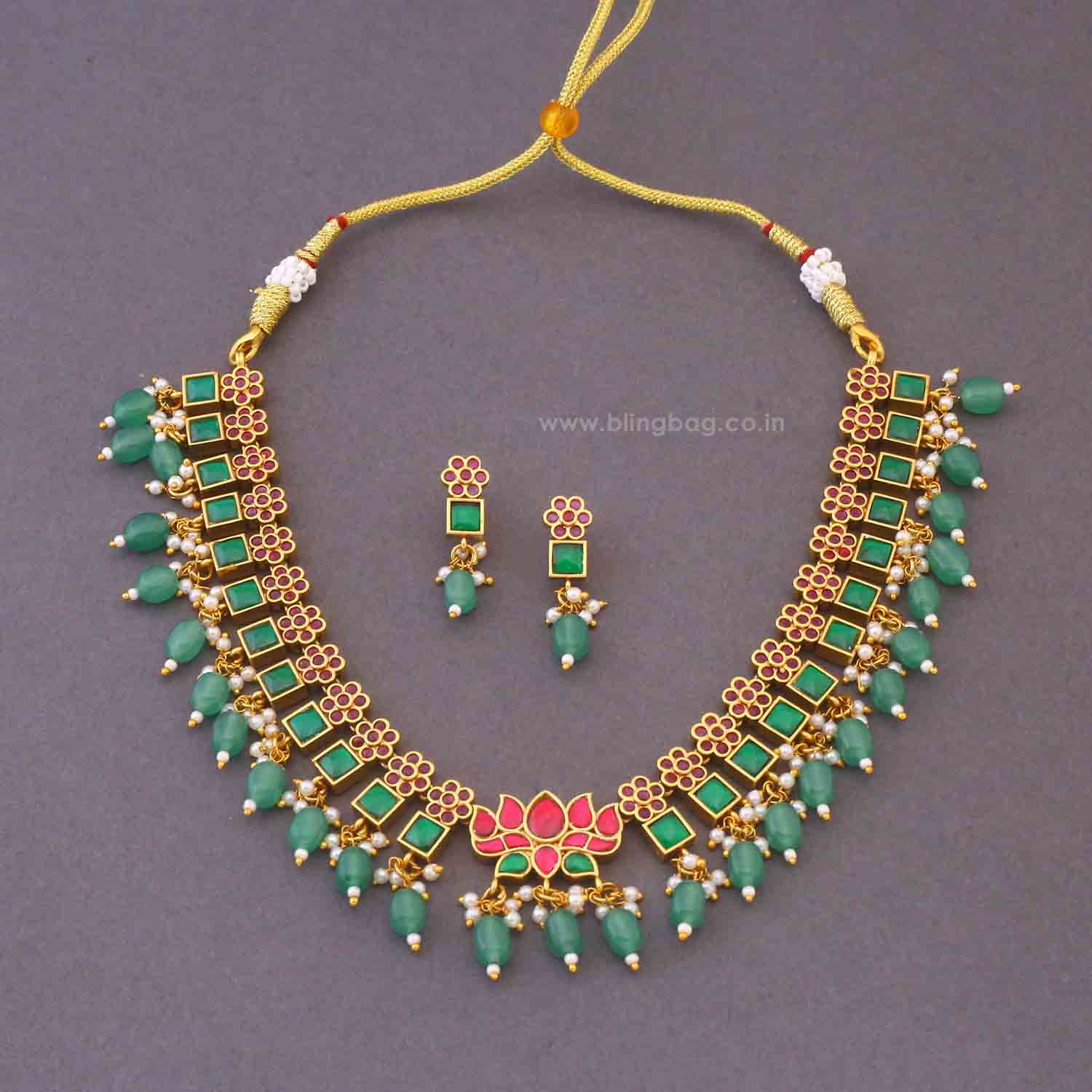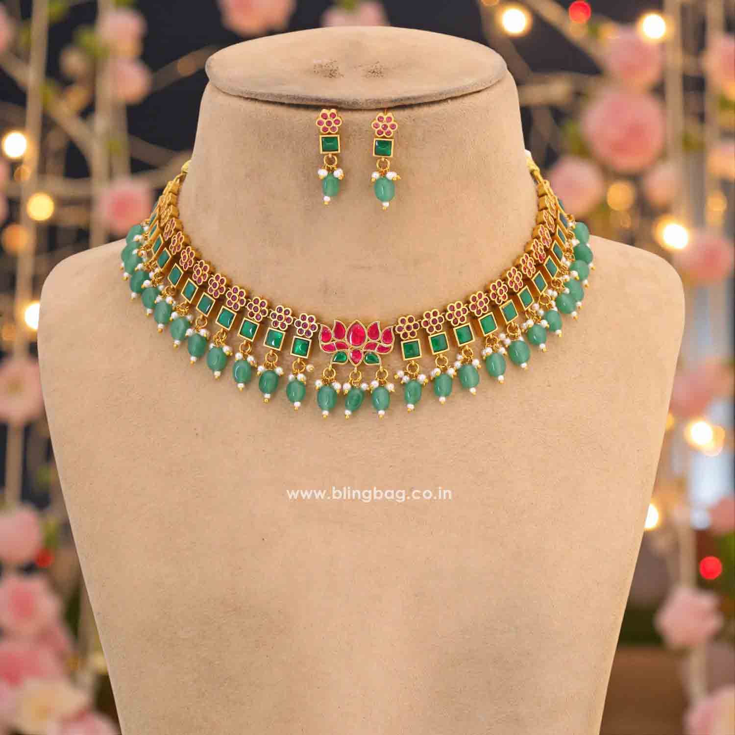 The handcrafted lotus motif adds a traditional touch with a rich South Indian temple-jewellery vibe.