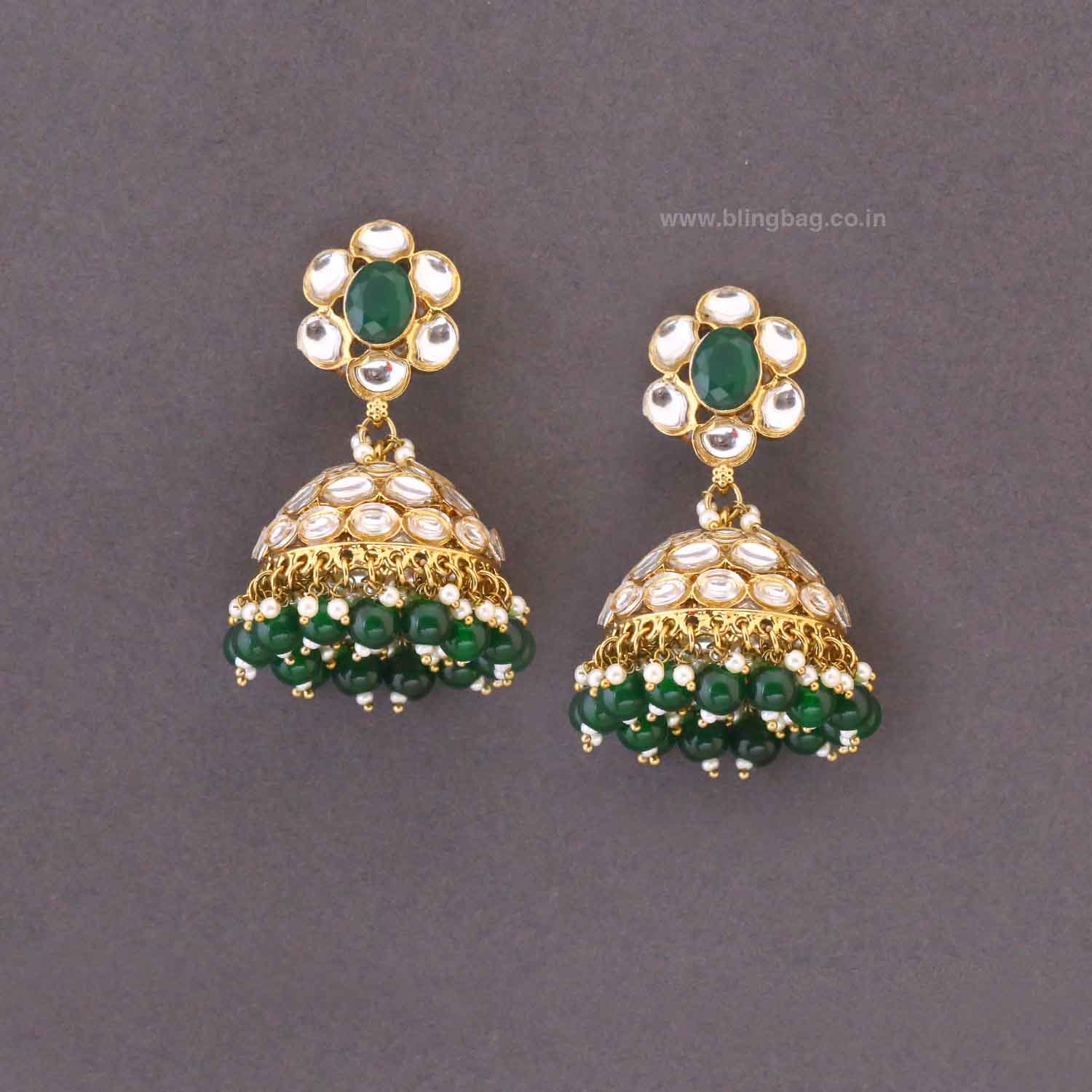 Graceful Jhumkis earrings adorned with intricate kundan work and layered stone detailing, finished with delicate pearl drops for a royal appeal. A timeless statement piece that beautifully reflects traditional elegance.