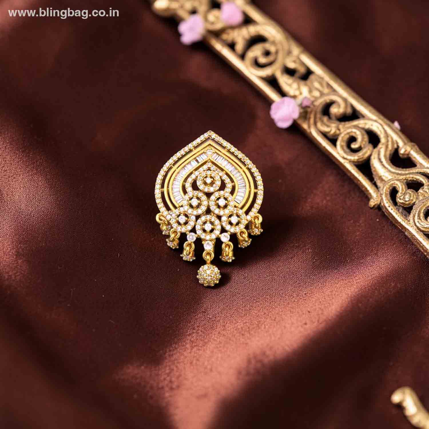 Pin this to the shoulder of a deep emerald or forest green saree (as shown) to create a striking contrast that allows the gold and Zirconia to pop.