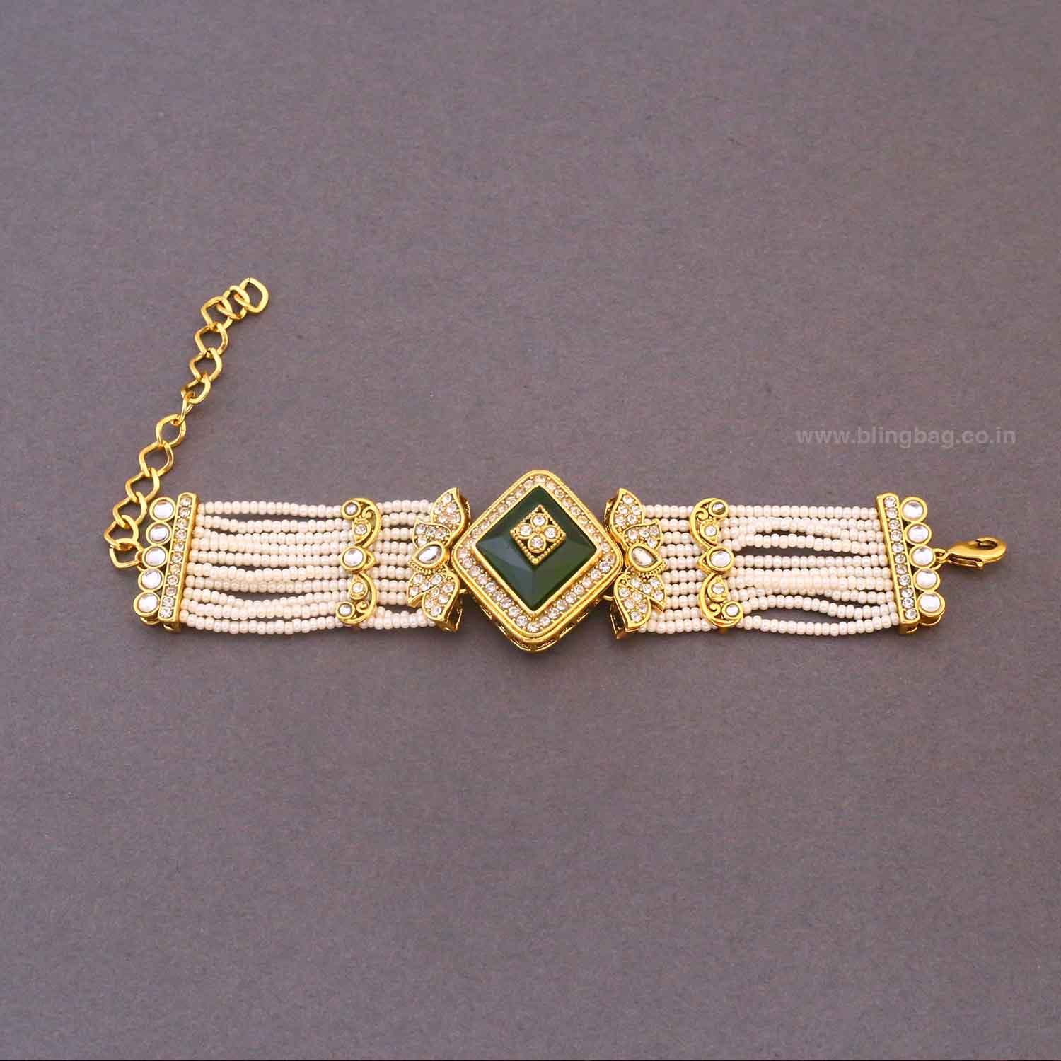 This elegant statement bracelet features multiple delicate pearl strands beautifully connected to a bold square centerpiece adorned with intricate stone detailing. The refined design blends classic charm with a regal touch, making it perfect for festive and wedding wear.