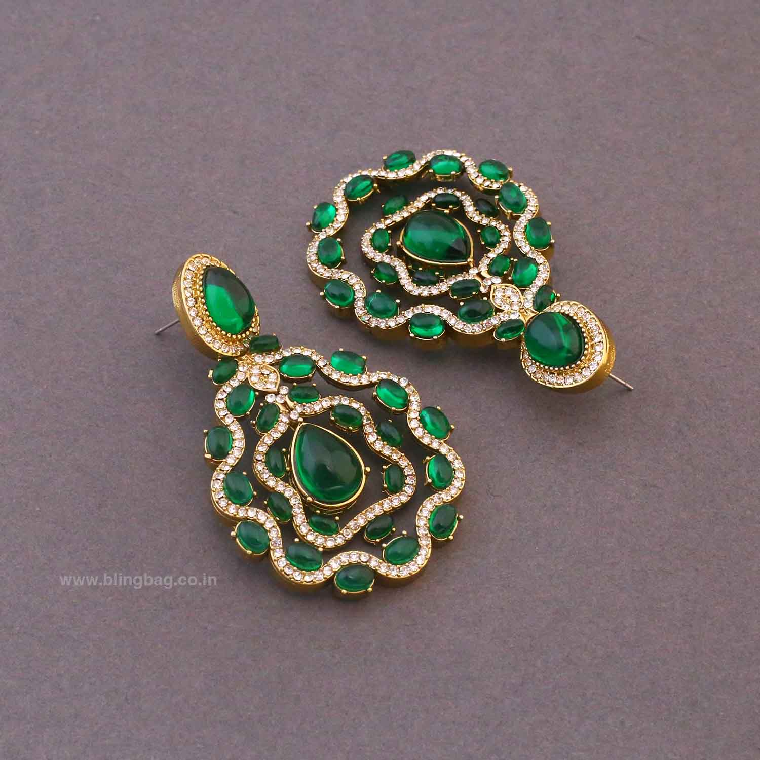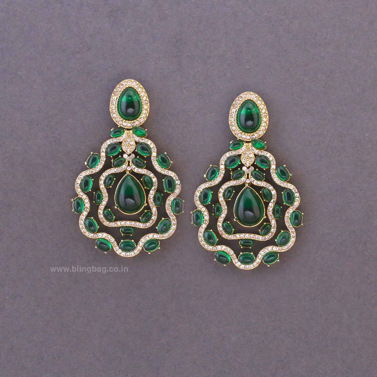 These elegant drop earrings feature a graceful layered design highlighted with soft-toned stones and fine crystal detailing. The structured silhouette with a central teardrop accent creates a refined statement look that feels festive and sophisticated.