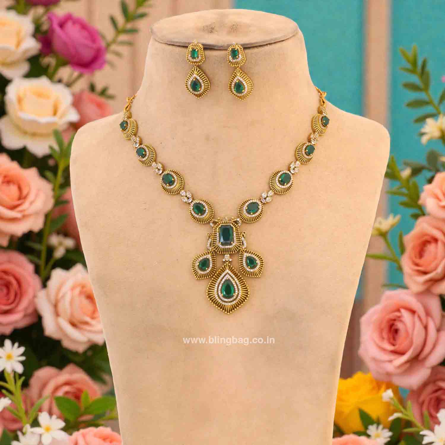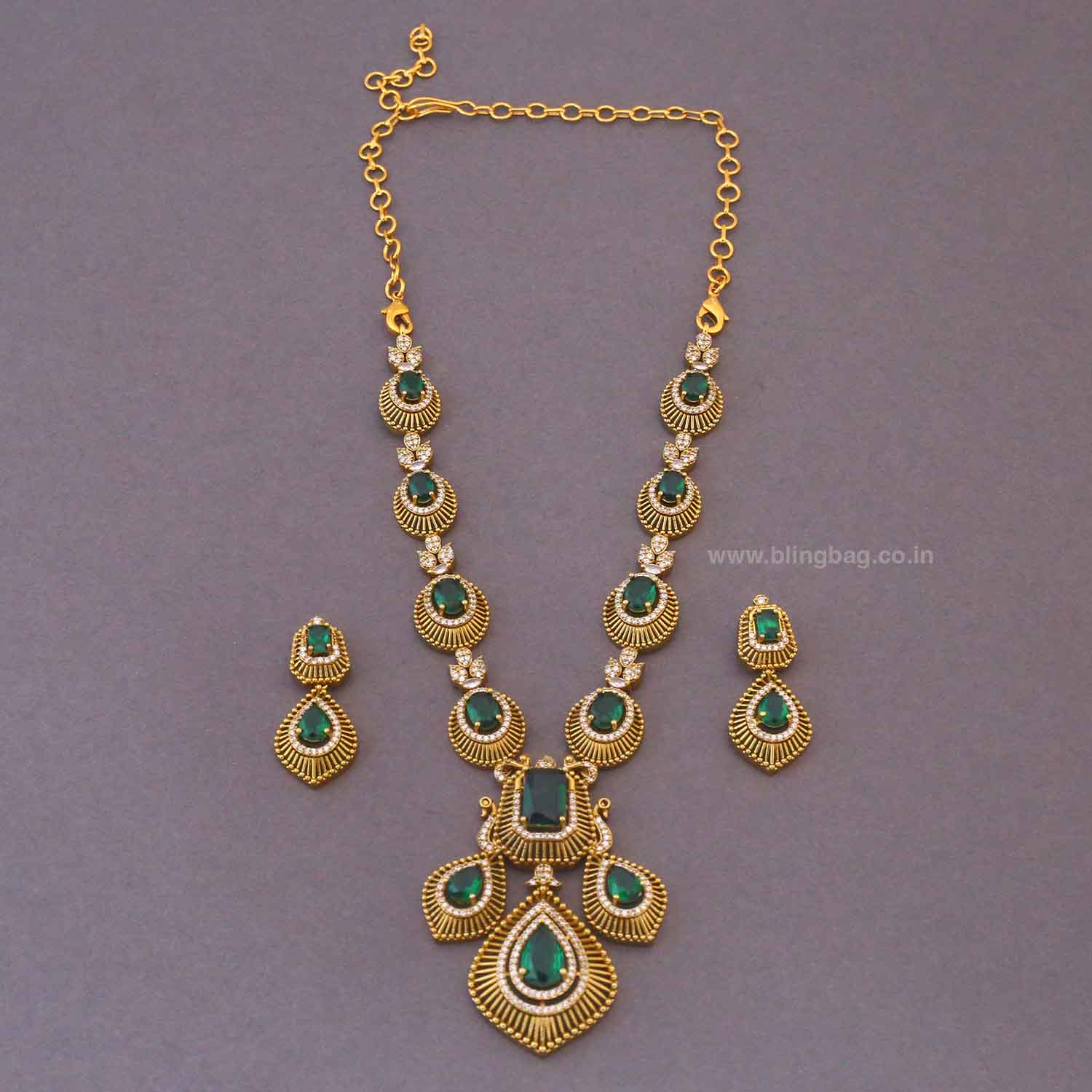 This elegant Victorian-style jewellery set features rich emerald-green stones framed in intricate gold detailing. The layered necklace with a striking central pendant adds depth and royal charm. Matching earrings complete the look with timeless sophistication.