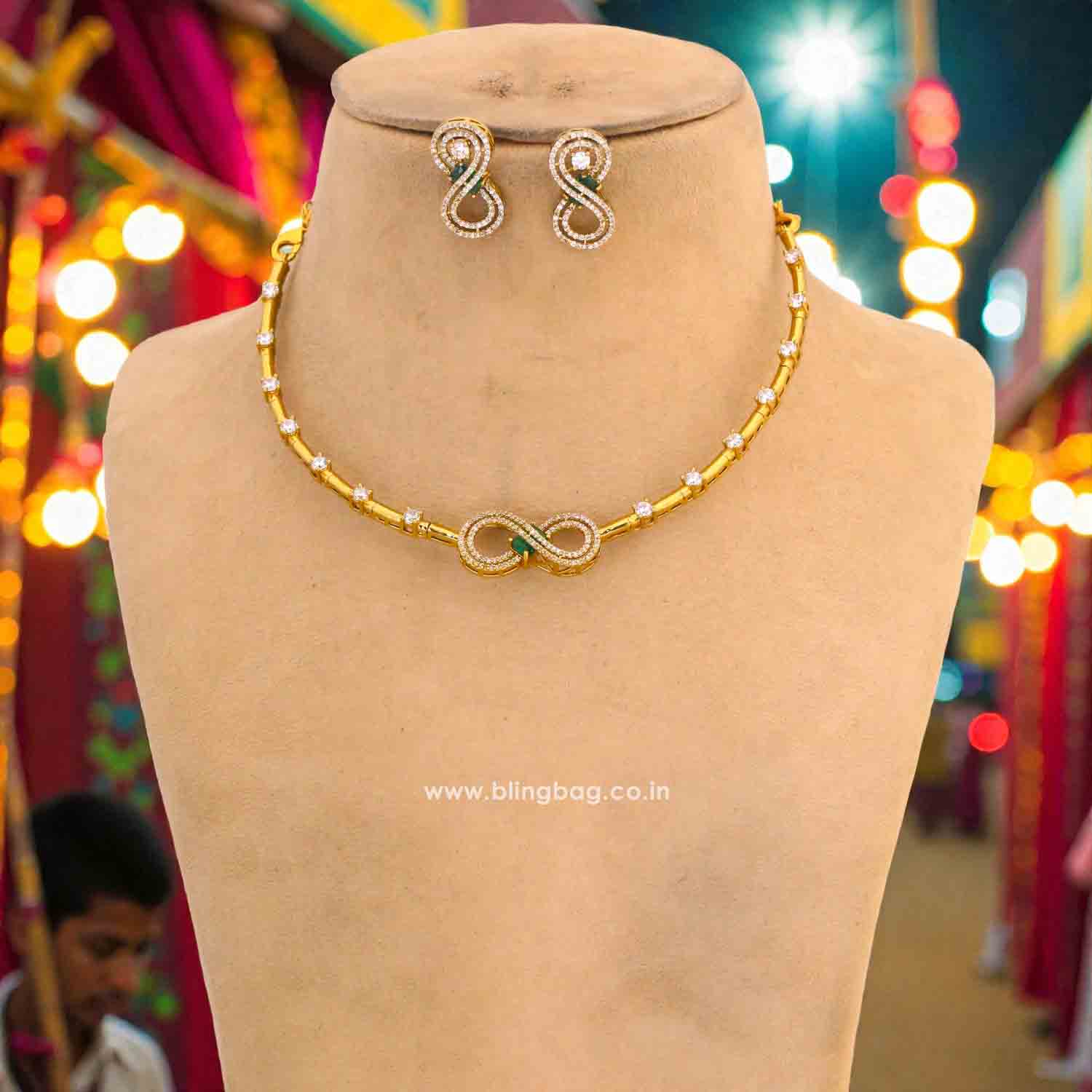 Pair this set with a solid-toned saree, gown, or contemporary ethnic outfit to highlight the infinity motif and keep the look clean, classy, and effortlessly stylish.