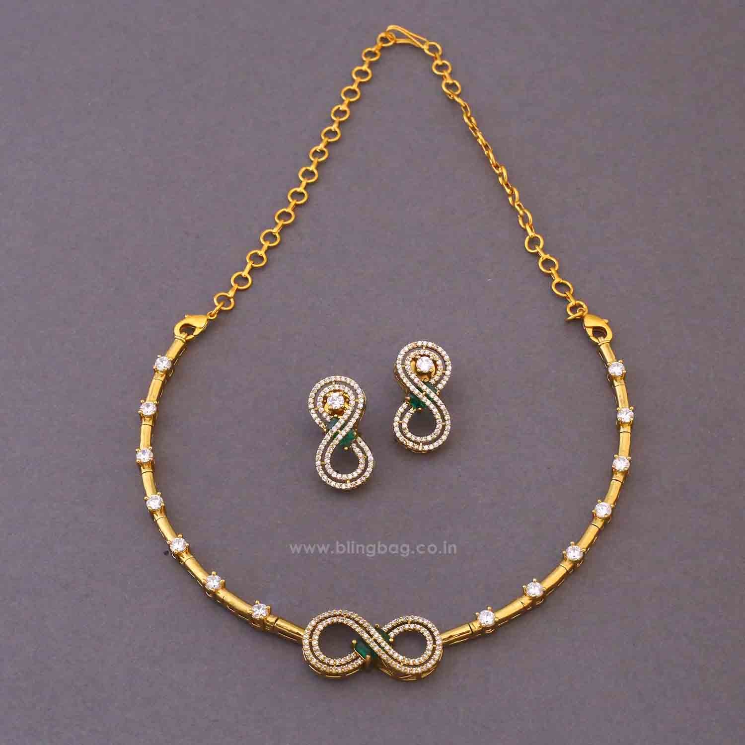 This elegant jewellery set features a sleek infinity-inspired design with fine stone detailing along a smooth curved base. The centerpiece highlights an intertwined infinity motif, while matching earrings mirror the same flowing pattern for a balanced and modern look. The overall design feels minimal yet graceful, making it suitable for refined occasions.