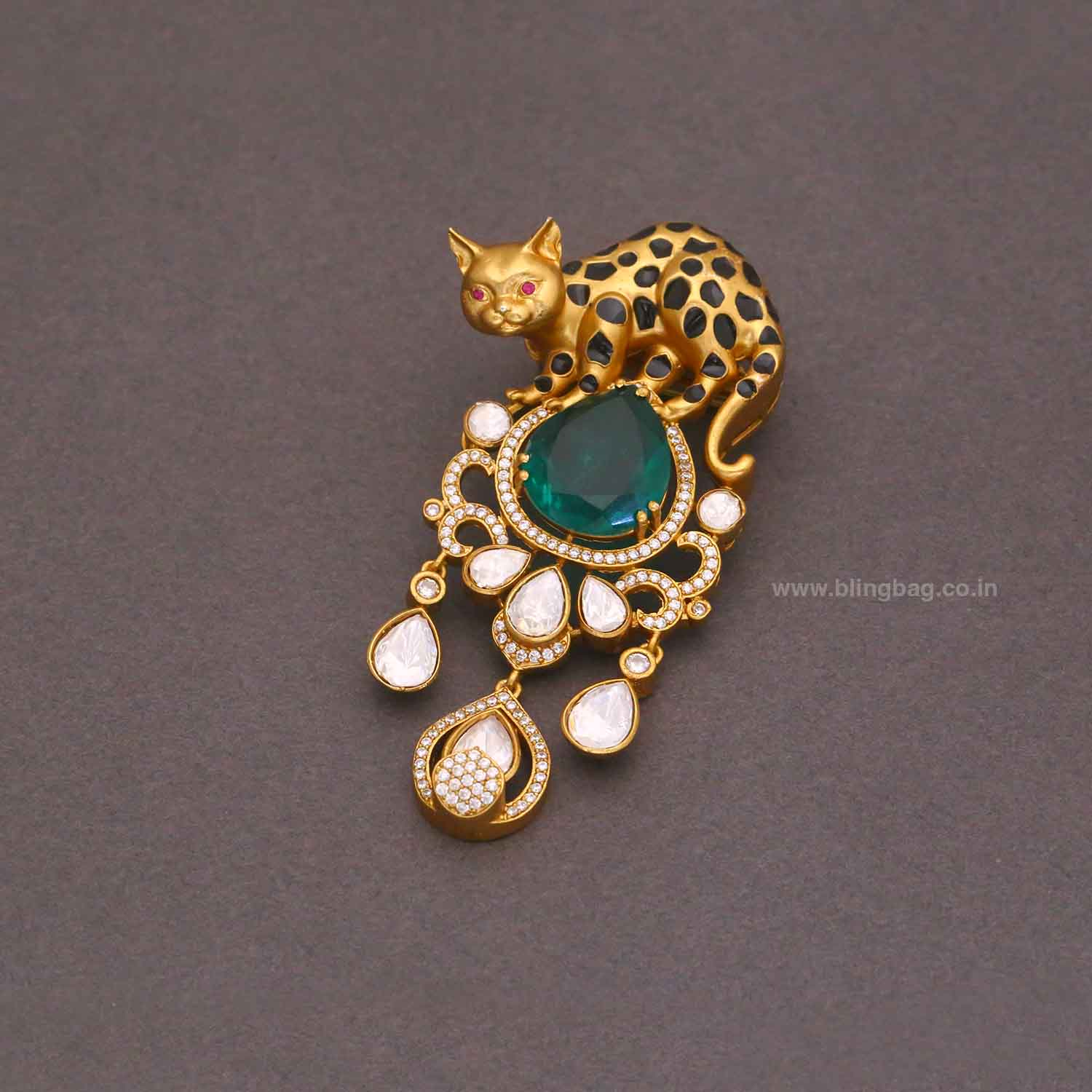 This exquisite cat-inspired brooch features a majestic feline perched above a striking emerald centerpiece, accented with sparkling crystals and elegant drop elements. The intricate vintage design and rich gold-tone finish make it a bold statement accessory.