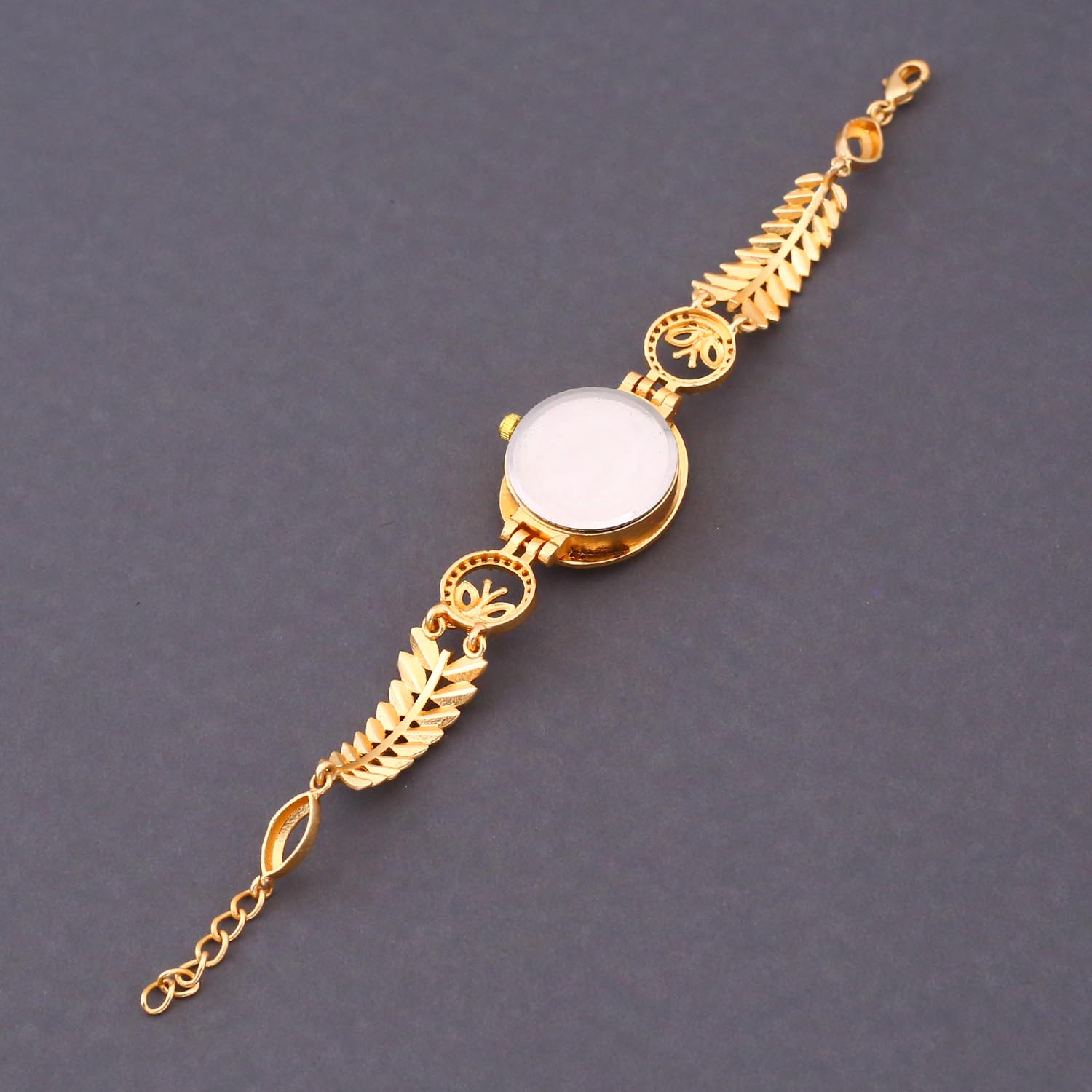 Step into timeless tradition with the Blingbag Gold- Plated Leaf Black Dial Design Watch. Featuring a rich black dial encased in a textured golden frame, this statement watch is adorned with stunning leaf motifs and crystal-studded floral connectors. A perfect fusion of jewelry and functionality, it effortlessly complements sarees, lehengas, and ethnic suits.