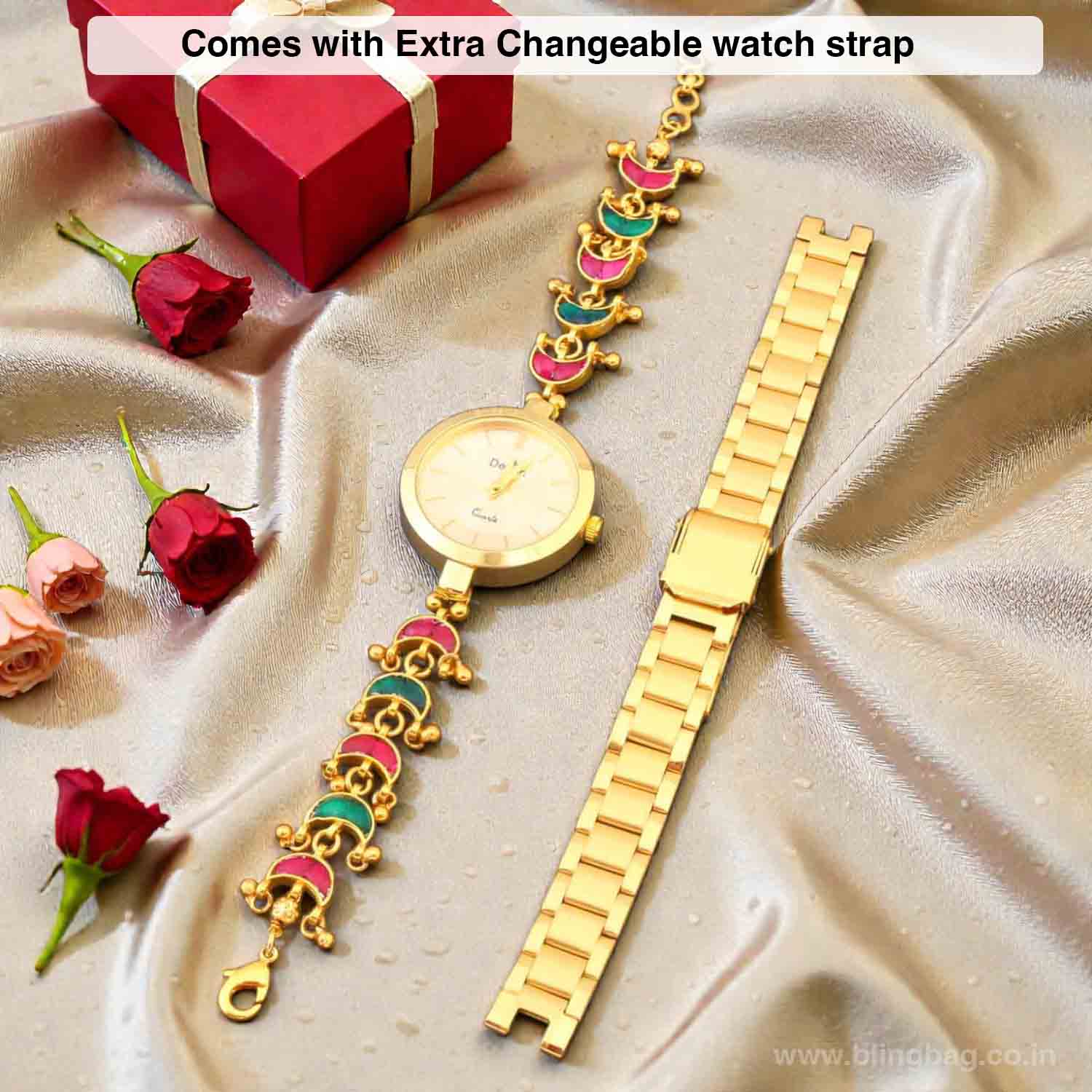 This elegant bracelet watch showcases colorful enamel crescent motifs paired with a classic gold-toned dial, creating a perfect blend of tradition and modern charm. Designed like jewellery, it adds a vibrant festive touch to your wrist.