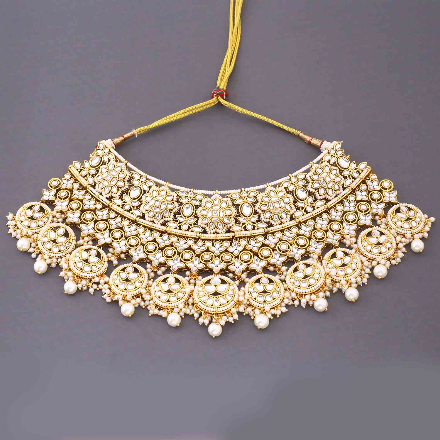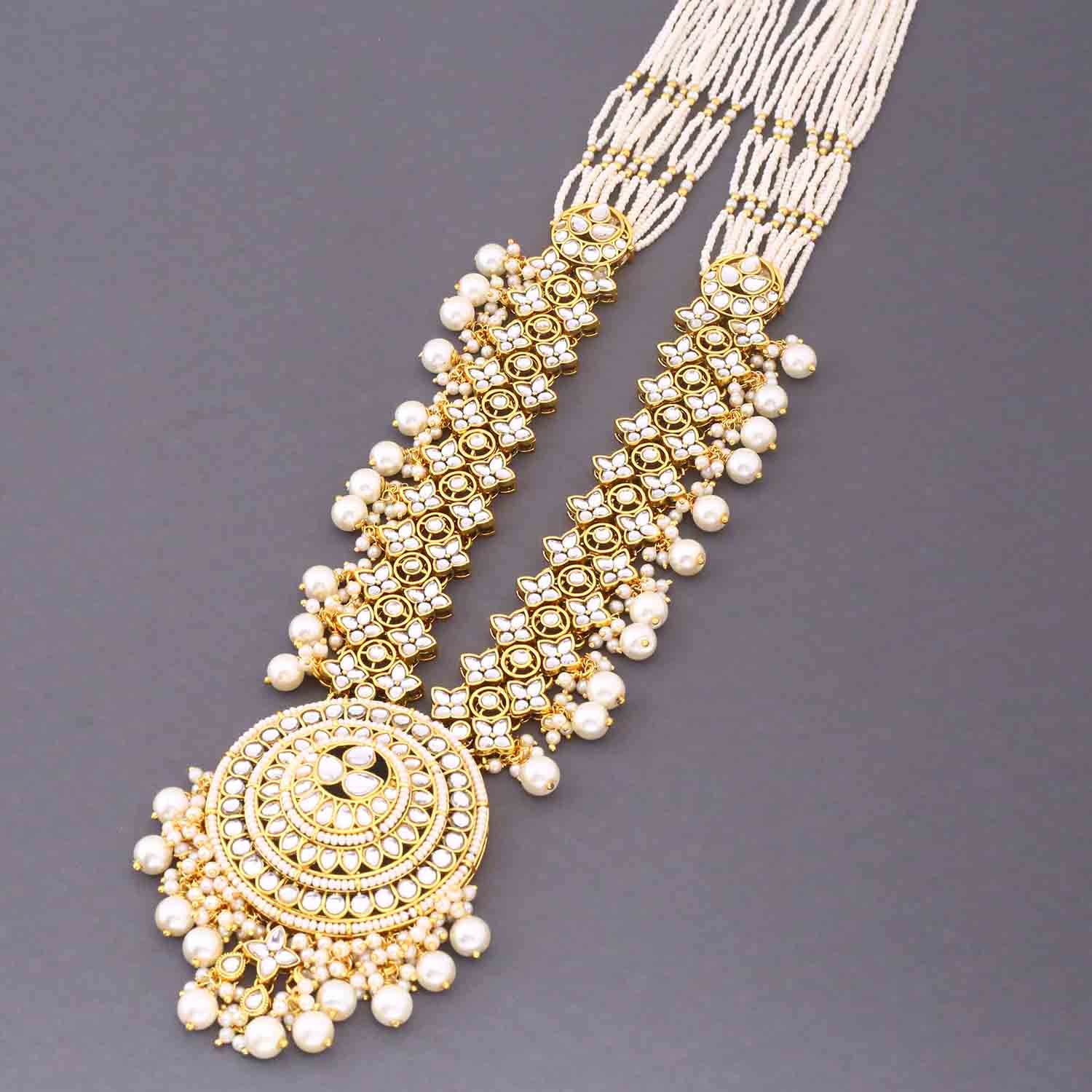 The set includes a stunning necklaces, matching earrings, and a beautiful maang tikka, all meticulously crafted with high-quality Kundan stones and lustrous pearls. The gold-plated finish adds a touch of elegance, making it a perfect complement to any bridal ensemble. With proper care, this jewelry will remain a cherished keepsake for years to come