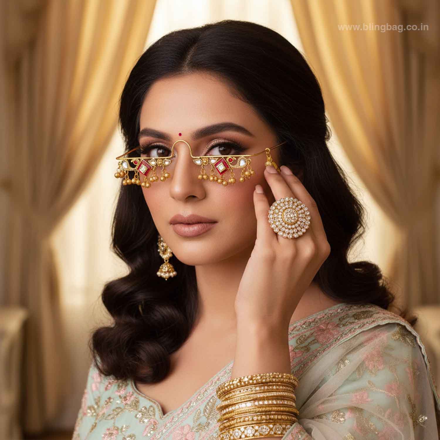 - Style with open hair or soft curls to highlight the design