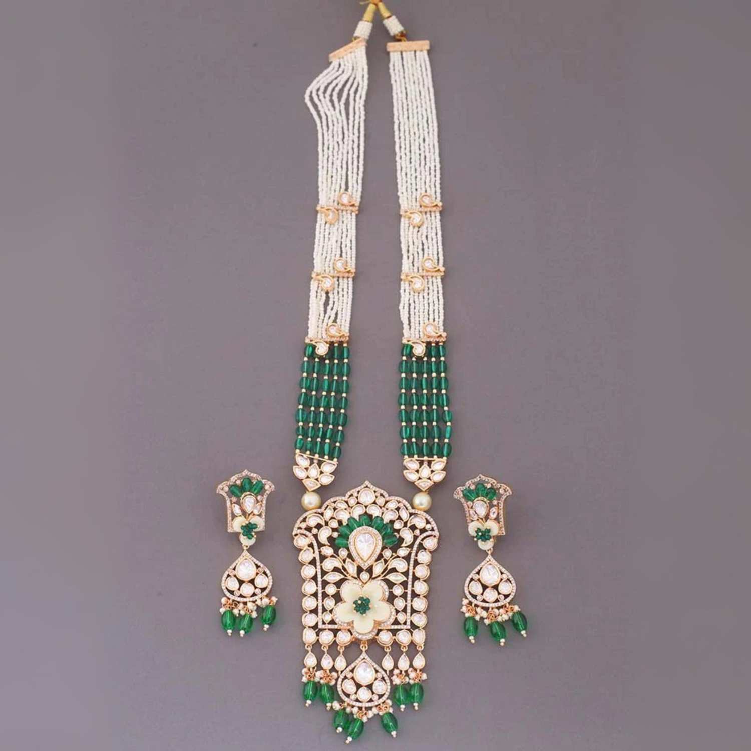 This necklace is the ultimate accessory option for the festive season. This set has a gorgeous circular floral pattern. The necklace has vibrant pearl detailing all over. The set also has a bright element of Kundan detailing in its structure. So, don't miss out on this gorgeous necklace set this eventful season as you have ramps to walk ahead.