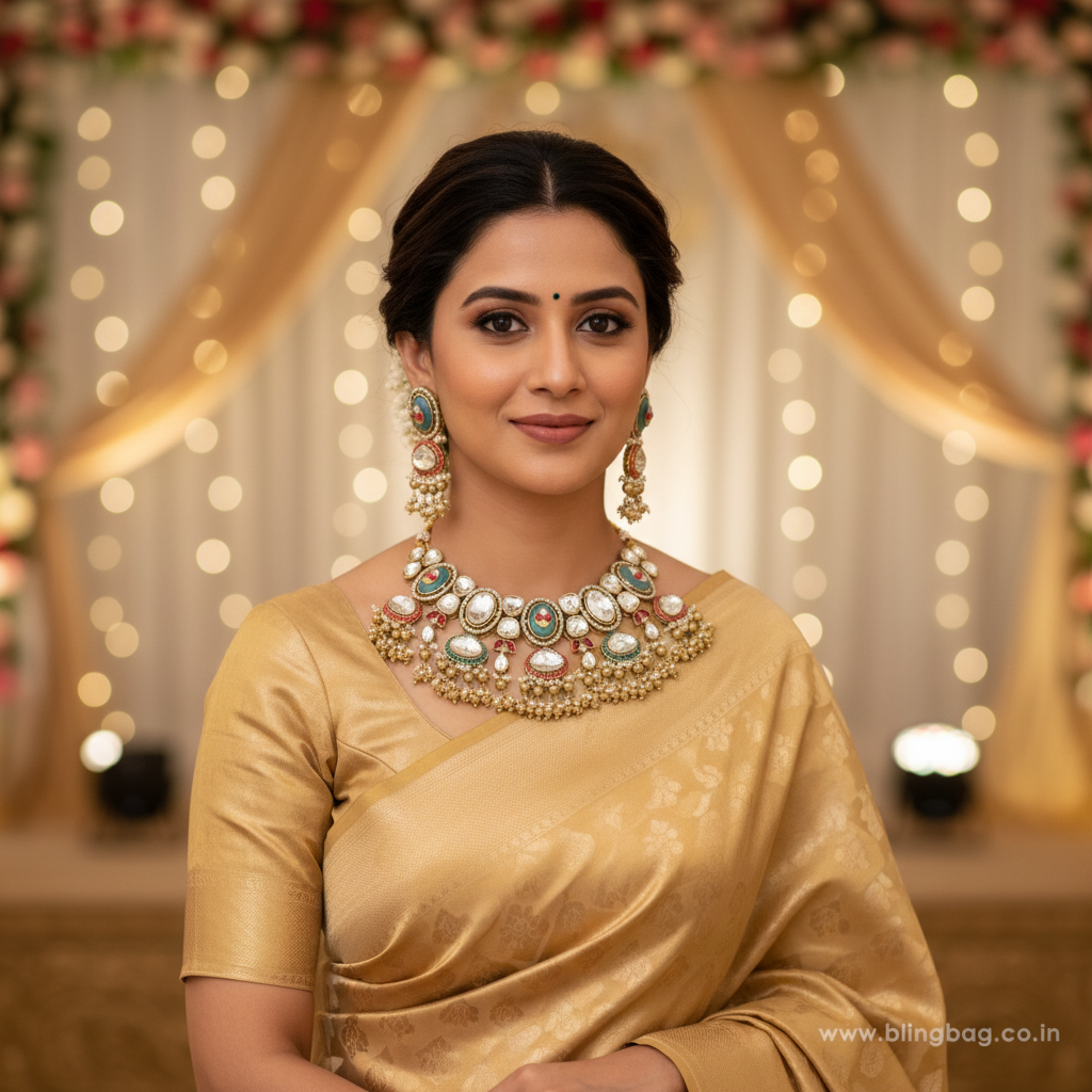 Blingbag’s Heritage Necklace Sets celebrate India’s rich jewellery history with designs inspired by royal craftsmanship, antique gold textures and temple-style detailing. These sets are perfect for brides who prefer classic elegance and women who want jewellery that feels timeless. Featuring intricate engravings, traditional motifs and handcrafted finishes, each heritage piece adds depth and cultural richness to your festive wardrobe.