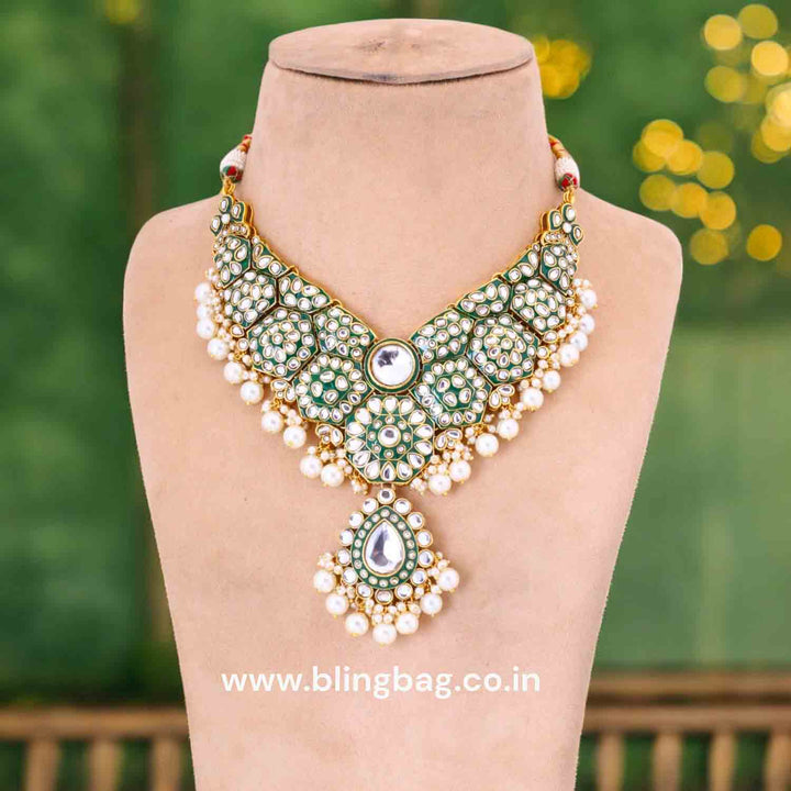 This necklace is the ultimate accessory option for the festive season. This set has a gorgeous circular floral pattern. The necklace has vibrant pearl detailing all over. The set also has a bright element of Kundan detailing in its structure. So, don't miss out on this gorgeous necklace set this eventful season as you have ramps to walk ahead.