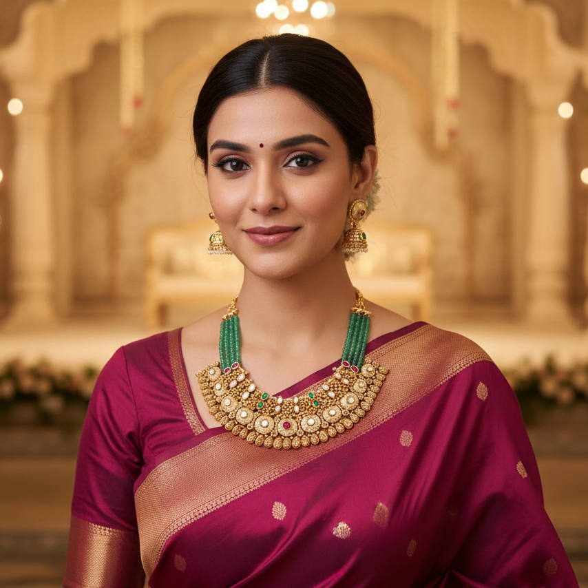 Let your rajwadi necklace be the star of the show. Pair it with simpler clothing like a silk saree or a flowing kurta to make the intricate details shine.