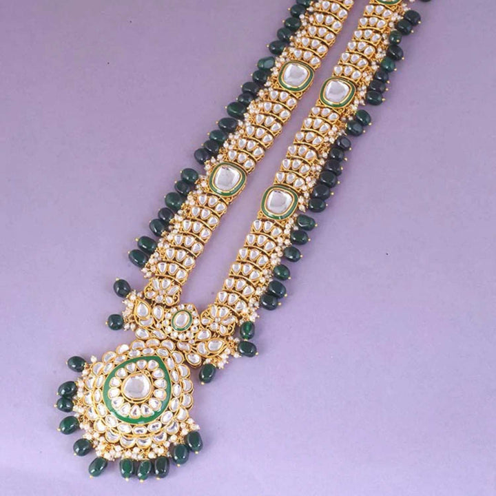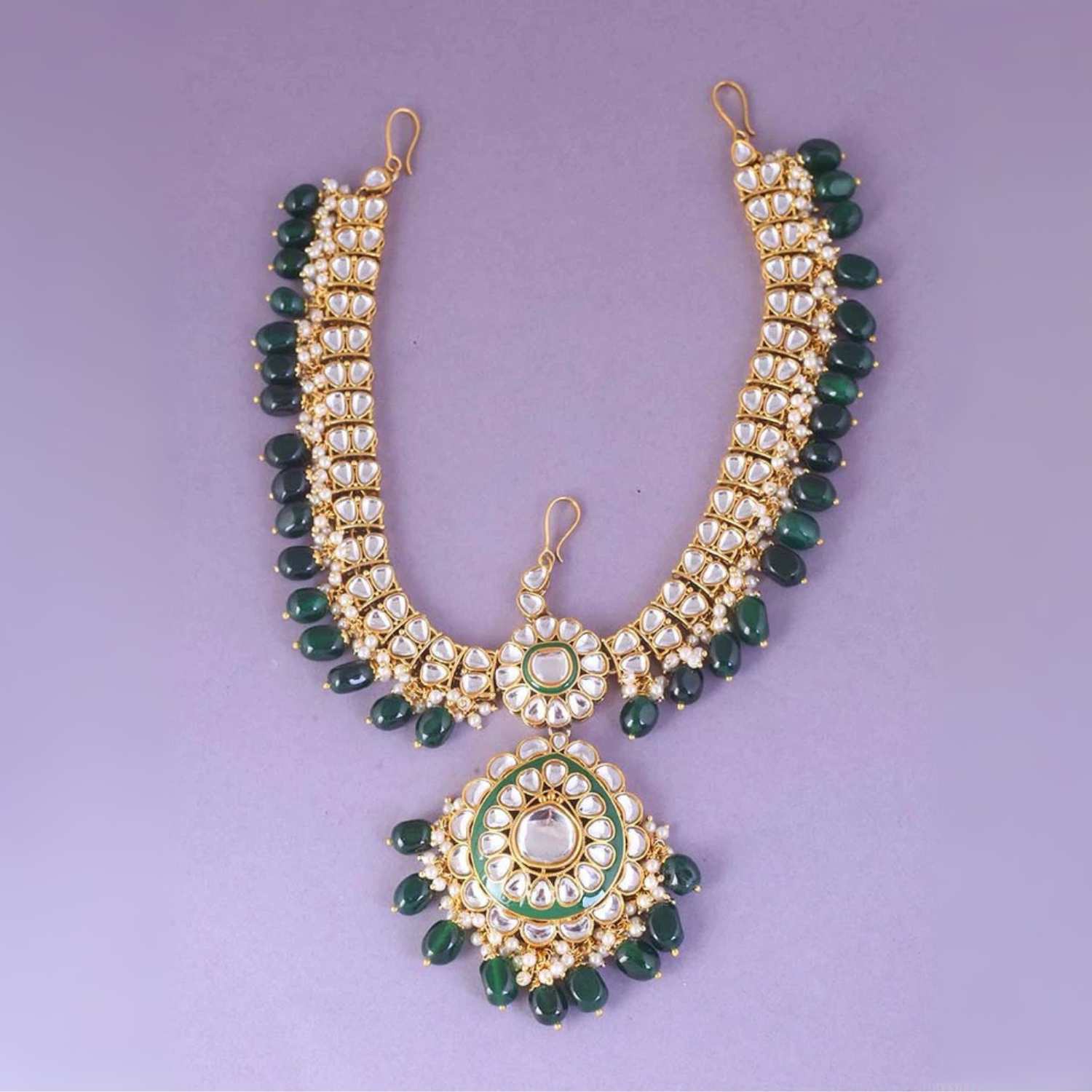 The set includes a stunning necklaces, matching earrings, and a beautiful maang tikka, all meticulously crafted with high-quality Kundan stones and lustrous pearls. The gold-plated finish adds a touch of elegance, making it a perfect complement to any bridal ensemble. With proper care, this jewelry will remain a cherished keepsake for years to come