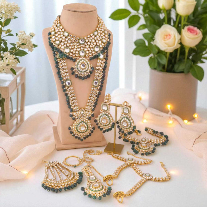 • Unit: Two Necklaces, One Pair Of Earrings, One Maang Tikka, One Matha Patti, Pair of Hathphool and a Nath.