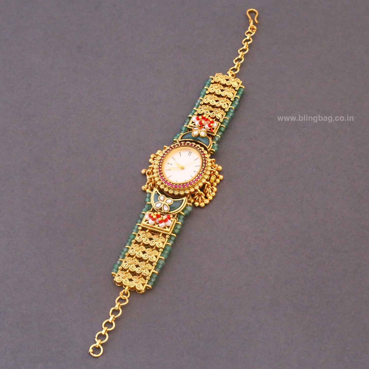 This royal heritage bracelet watch is beautifully designed with intricate traditional motifs and a classic round dial at the center. The detailed craftsmanship and ornamental styling make it a perfect fusion of jewellery and timepiece.