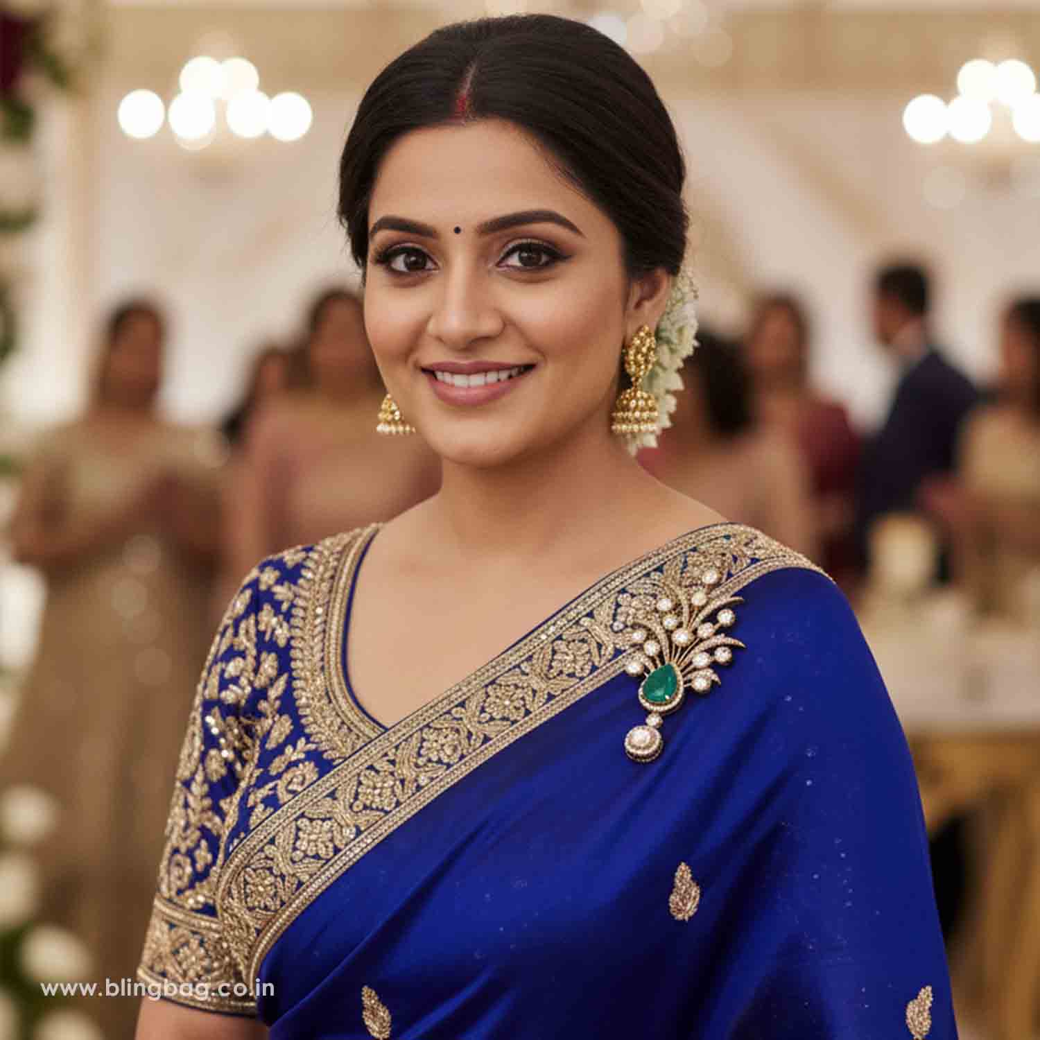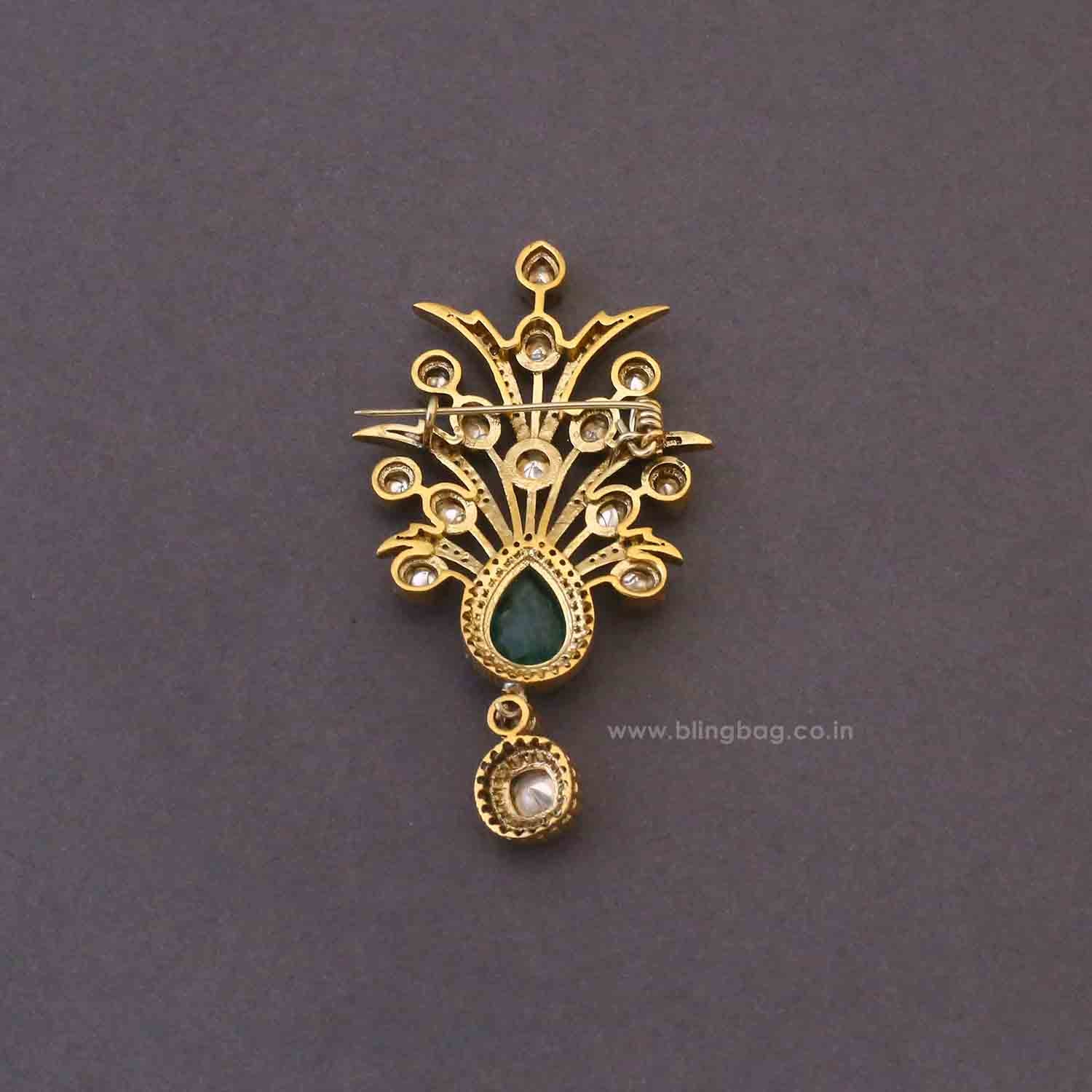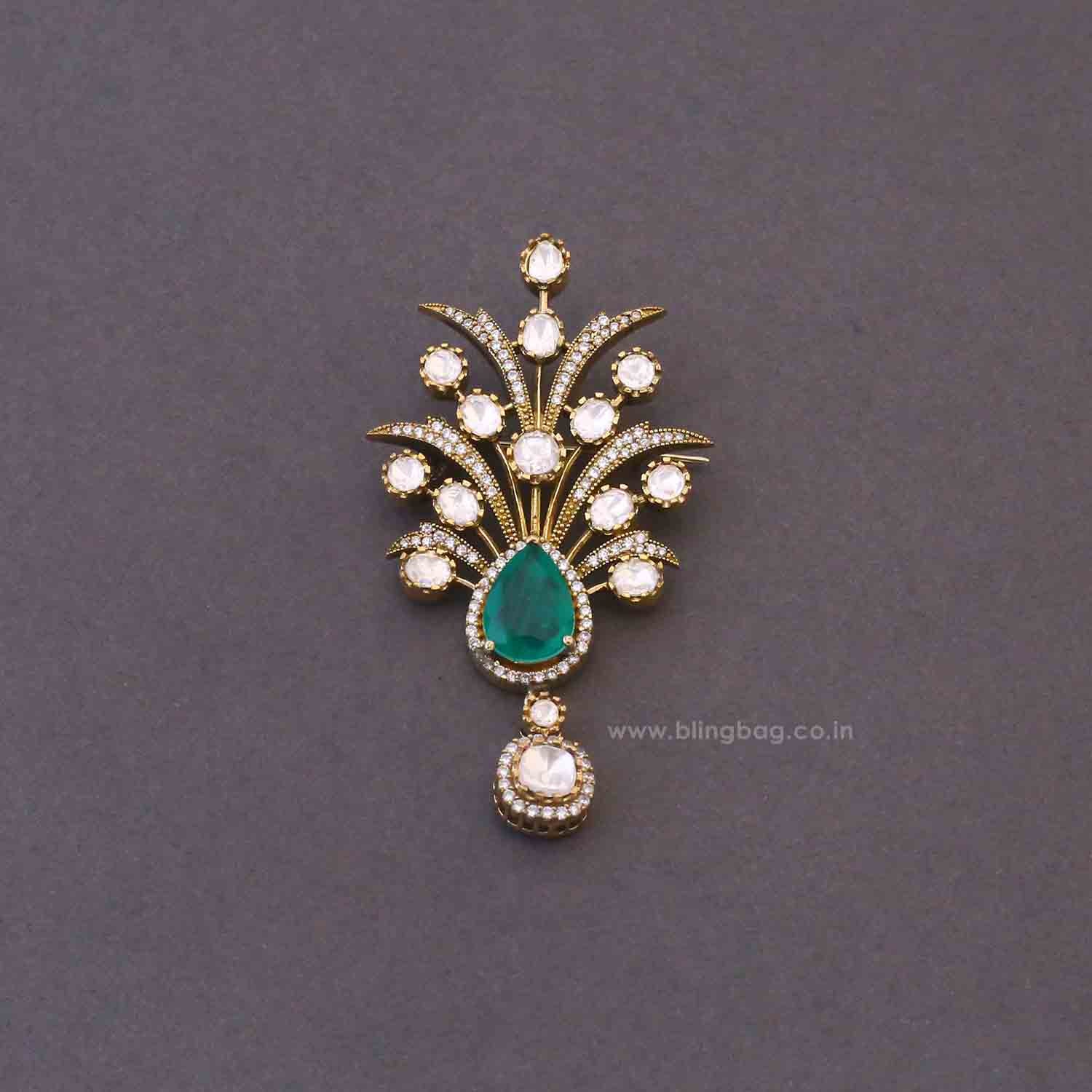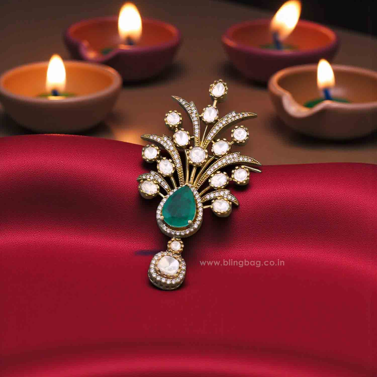 Pin this piece on a saree pallu, blouse, or ethnic outfit to add a statement accent. It also works well for festive gatherings and special occasions to elevate a classic look.