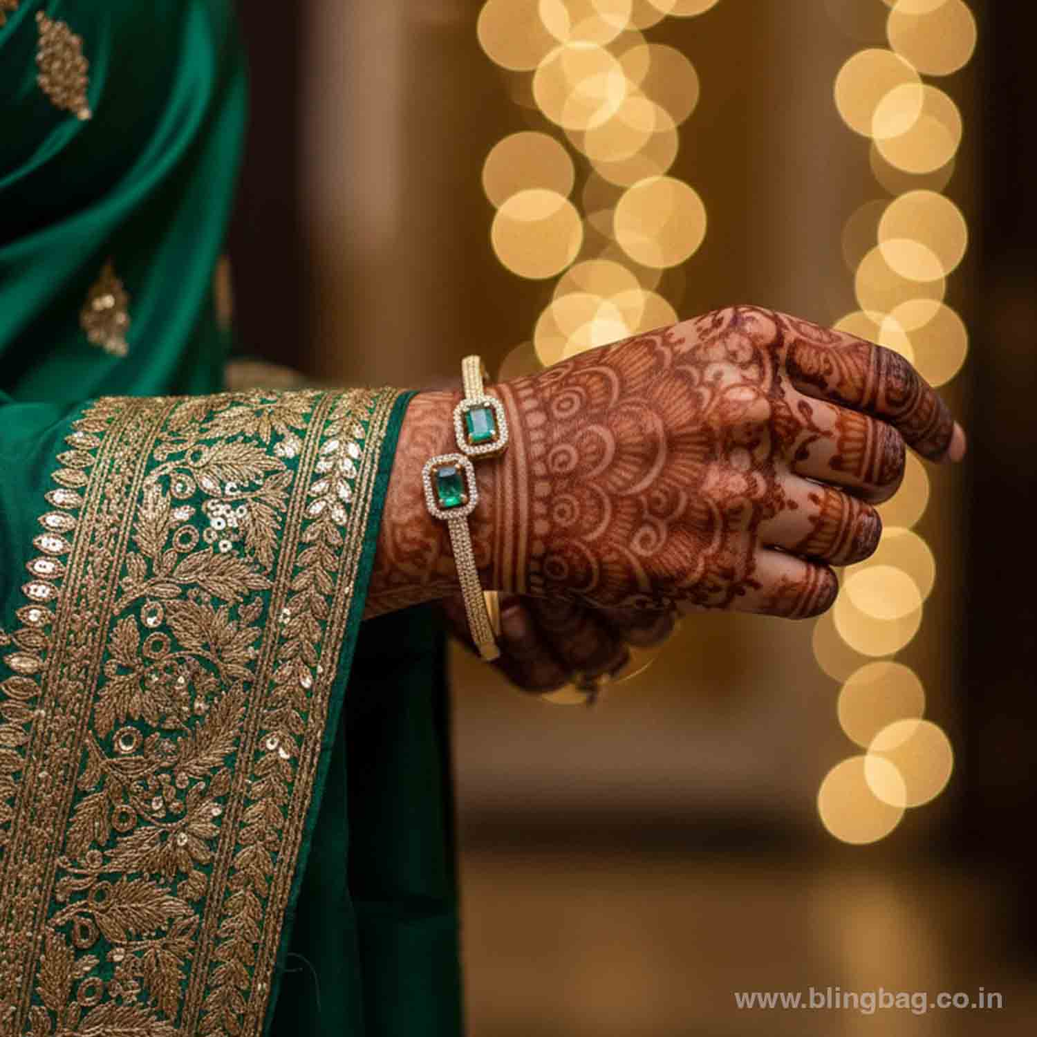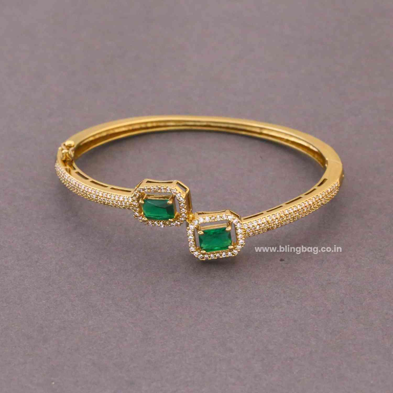 This elegant gold-toned bracelet showcases twin emerald-green square stones framed with dazzling crystals. Its sleek Victorian-inspired design adds a refined and luxurious touch to your style.