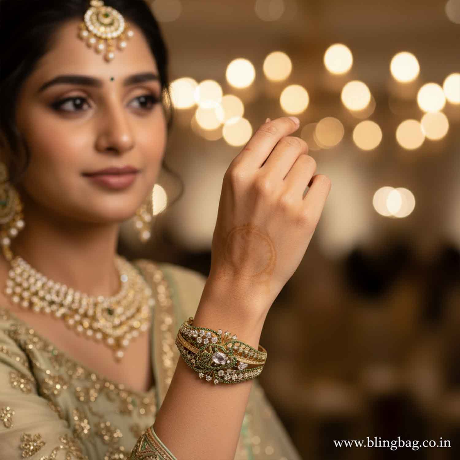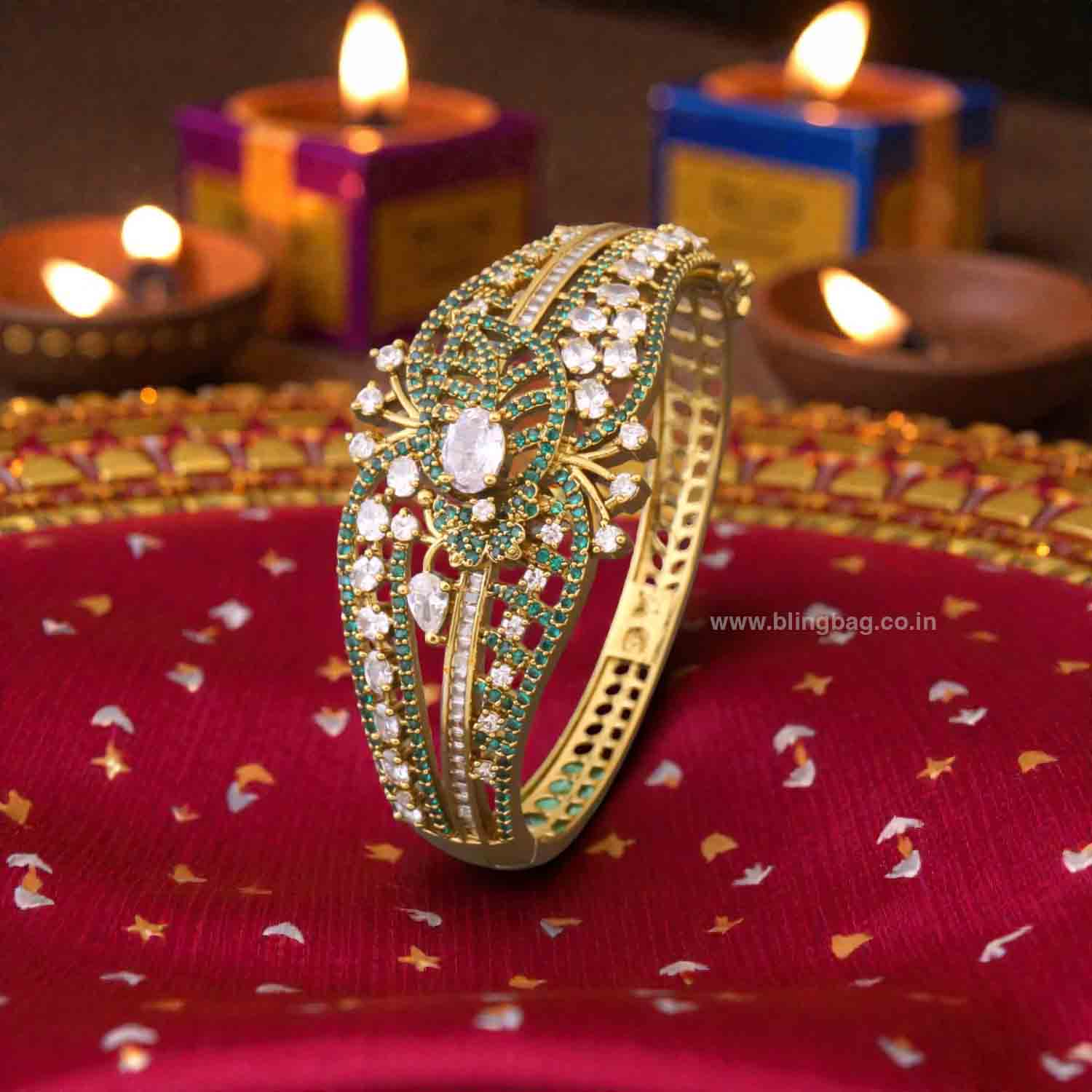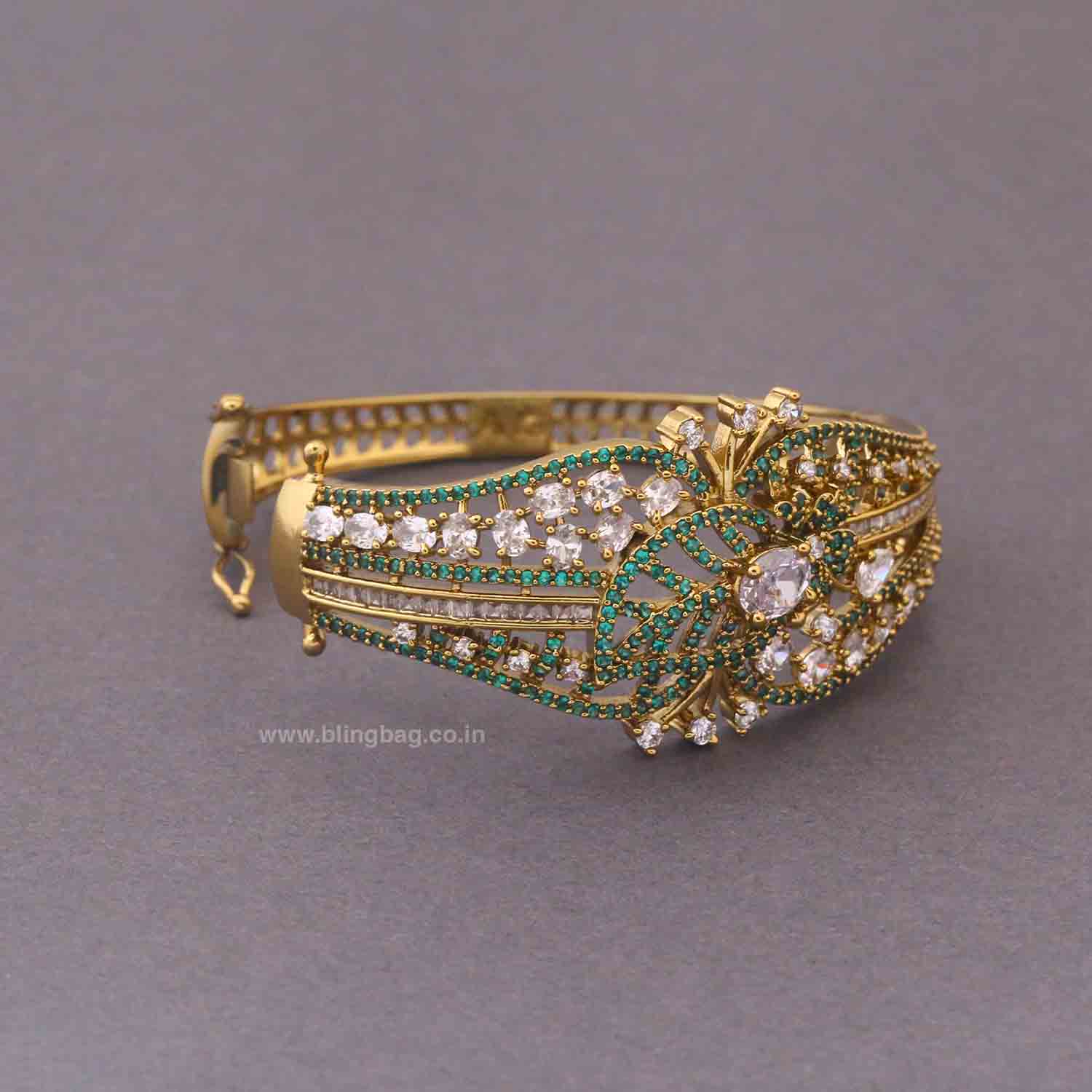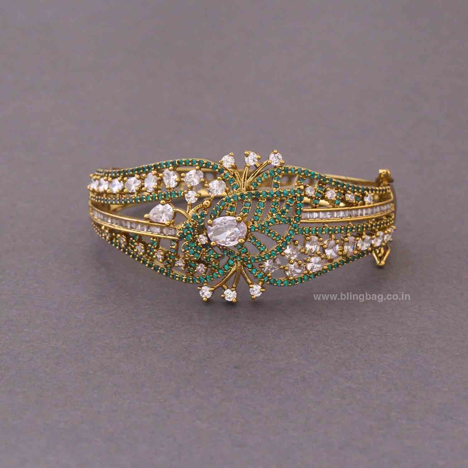 Stunning Victorian-style gold bracelet highlighted with emerald-green accents and a sparkling central stone. The intricate floral design adds a rich, royal touch with vibrant elegance.