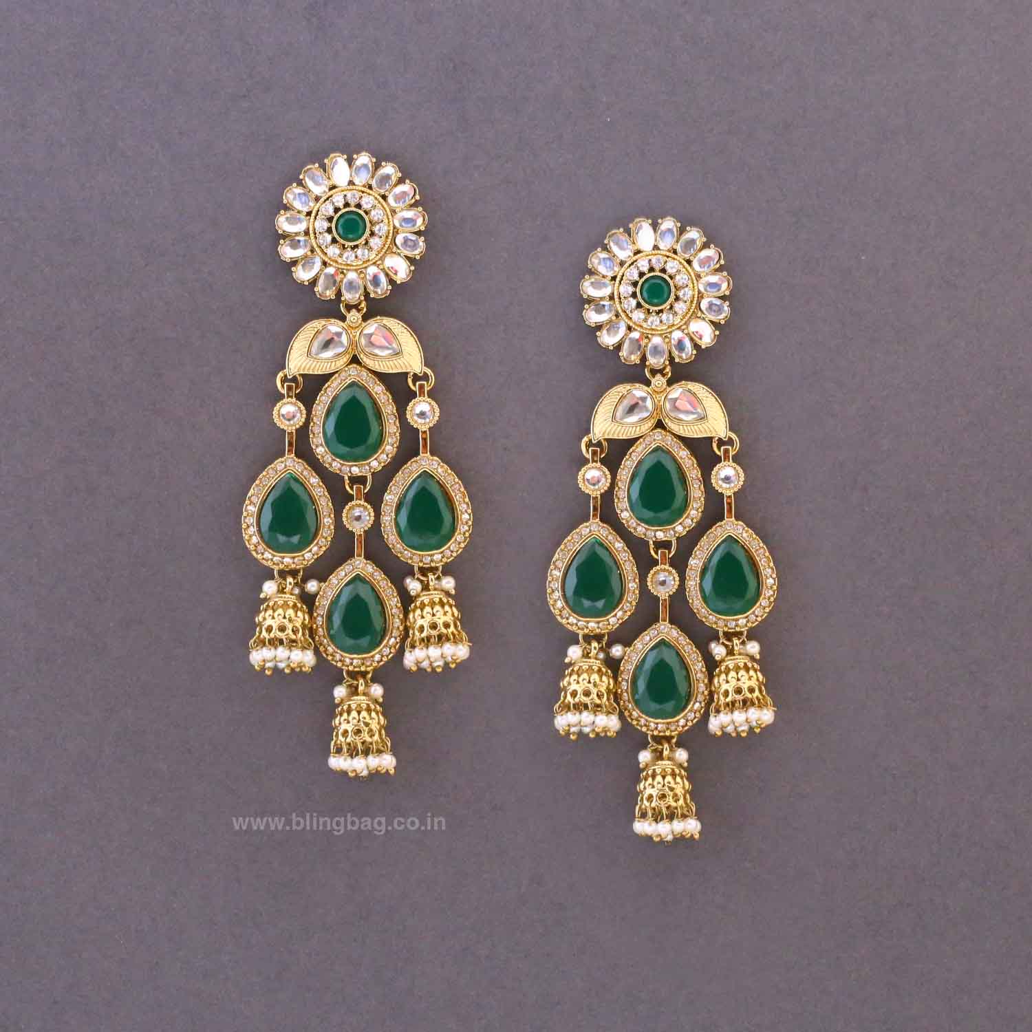 These elegant statement jhumki earrings feature a floral stud top connected to layered teardrop stones and intricate detailing. The cascading design is finished with delicate jhumki drops and tiny pearl accents, creating a graceful and festive look.