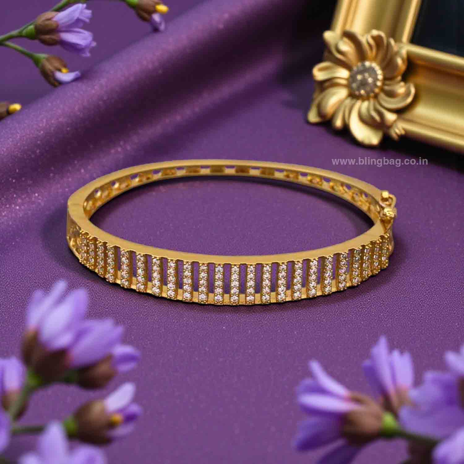 This classic gold-toned bracelet features a clean, structured design with evenly spaced vertical rows of shimmering stones. The uniform pattern gives it a refined, timeless look, while the subtle sparkle adds just the right amount of elegance. Sleek and well-balanced, it’s a versatile piece that never goes out of style.