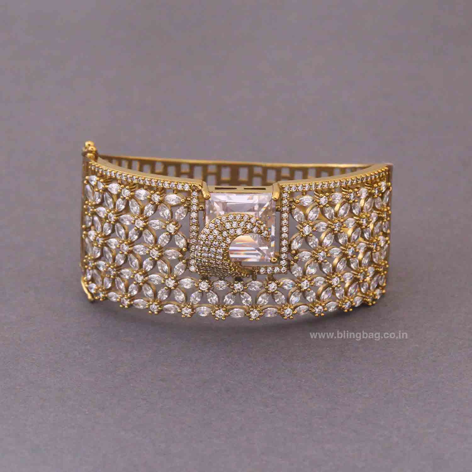 Opulent Victorian-style gold bracelet featuring a grand central stone with intricate floral crystal work on a wide band. A bold statement piece that radiates royal elegance and sparkle.