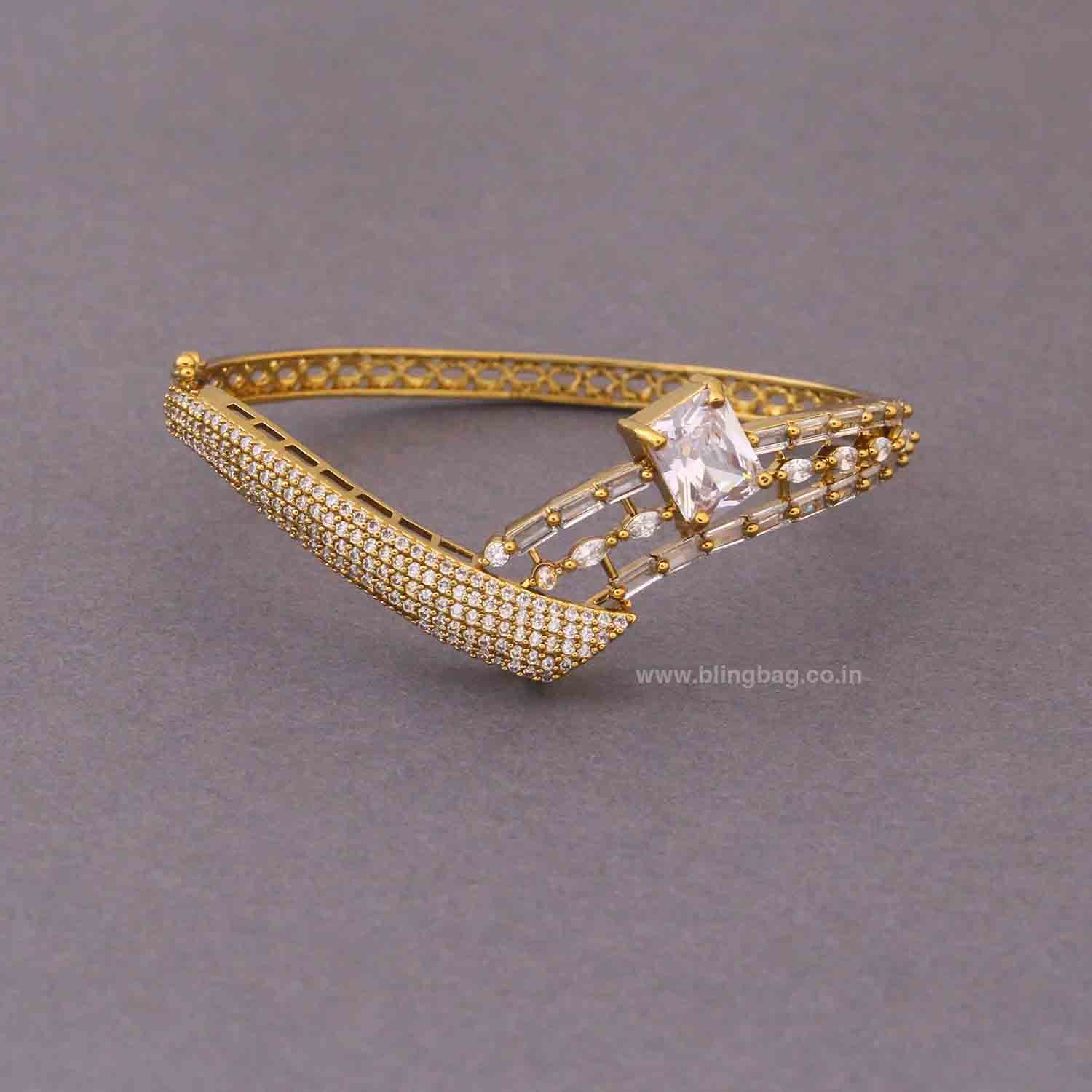 Elegant gold-tone bracelet featuring a bold geometric centerpiece with sparkling stone detailing and a refined lattice band. A perfect blend of Victorian charm and modern luxury.
