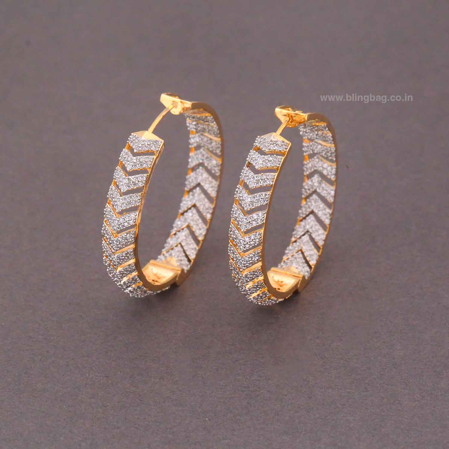 Elegant hoop earrings featuring a sleek chevron pattern adorned with shimmering zirconia stones for a refined sparkle. The modern textured design adds a stylish edge while keeping the look timeless and versatile.