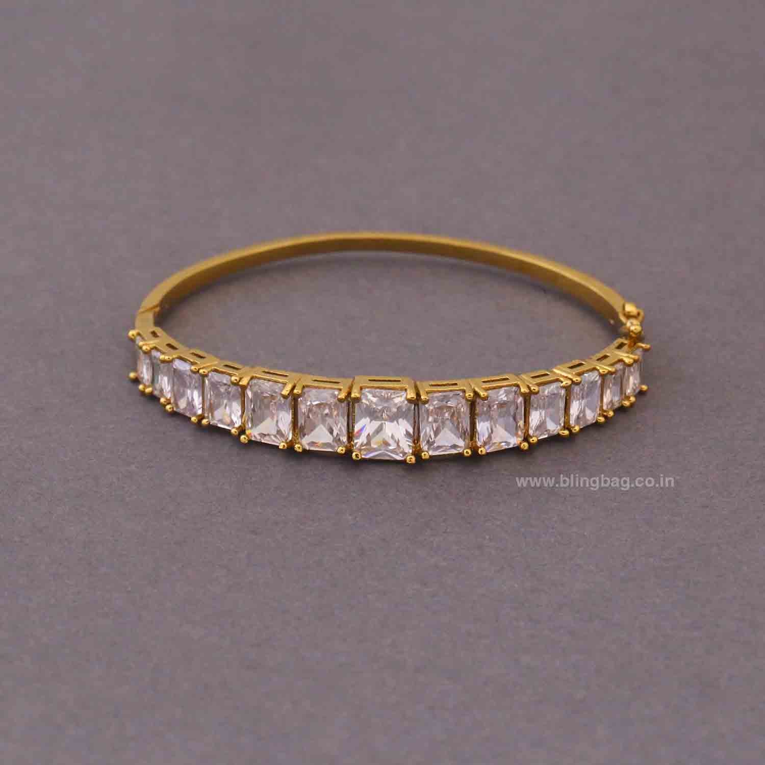 This elegant gold-toned bracelet showcases a sleek line of square-cut, crystal-clear stones, each neatly set in a continuous row. The sharp geometric cuts reflect light beautifully, giving the piece a sophisticated sparkle. Its slim profile and clean finish make it look modern yet timeless.