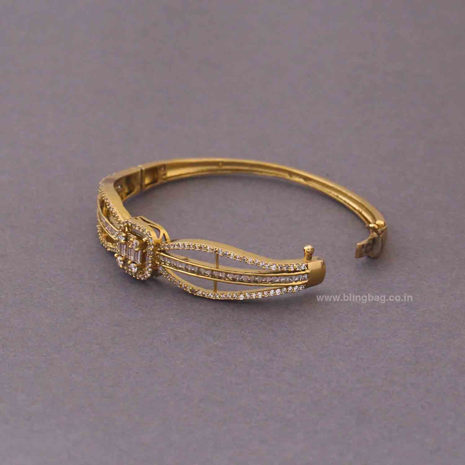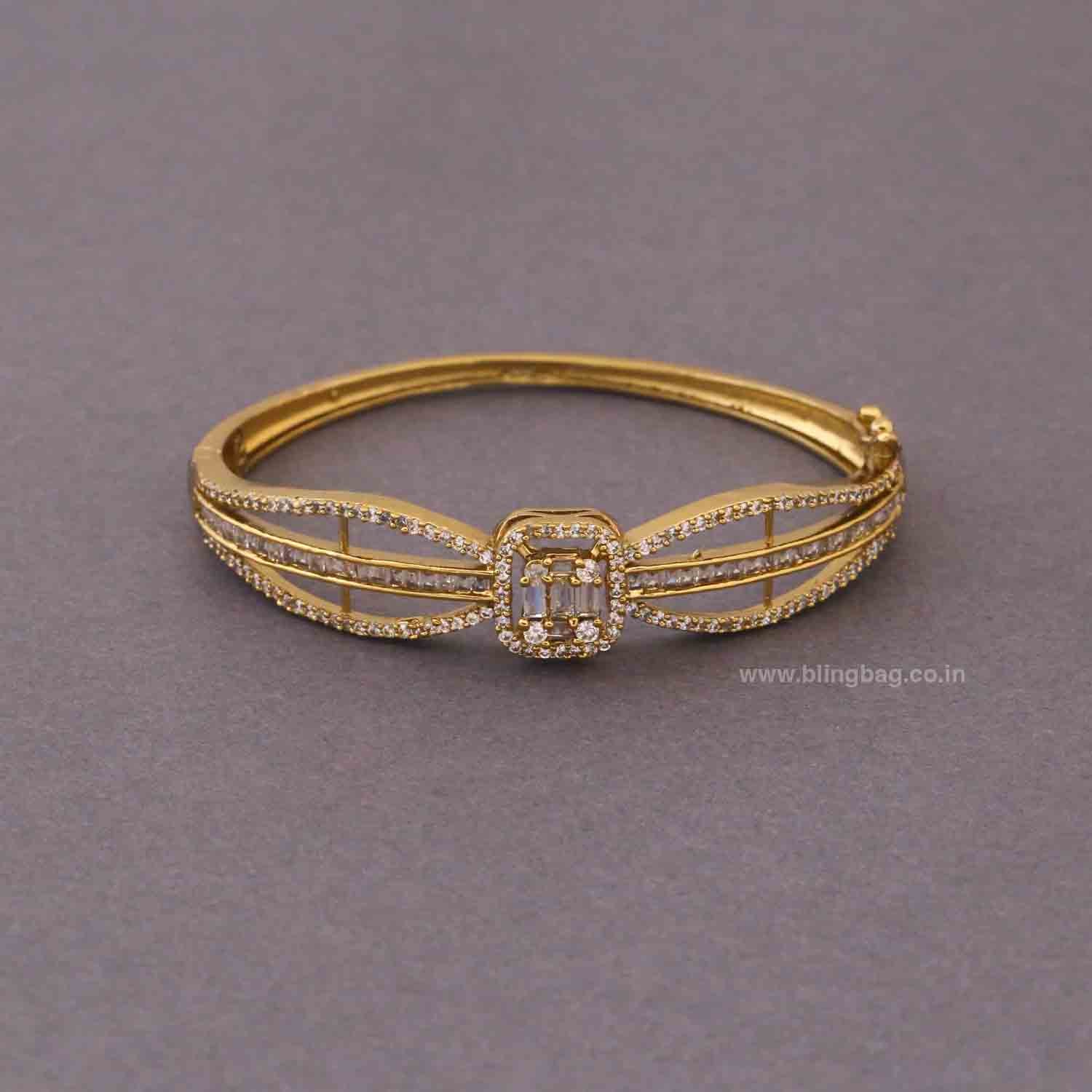 Graceful Victorian-style gold bracelet featuring a radiant central stone framed by delicate leaf-shaped crystals. Intricate detailing adds a regal sparkle with a soft, feminine charm.