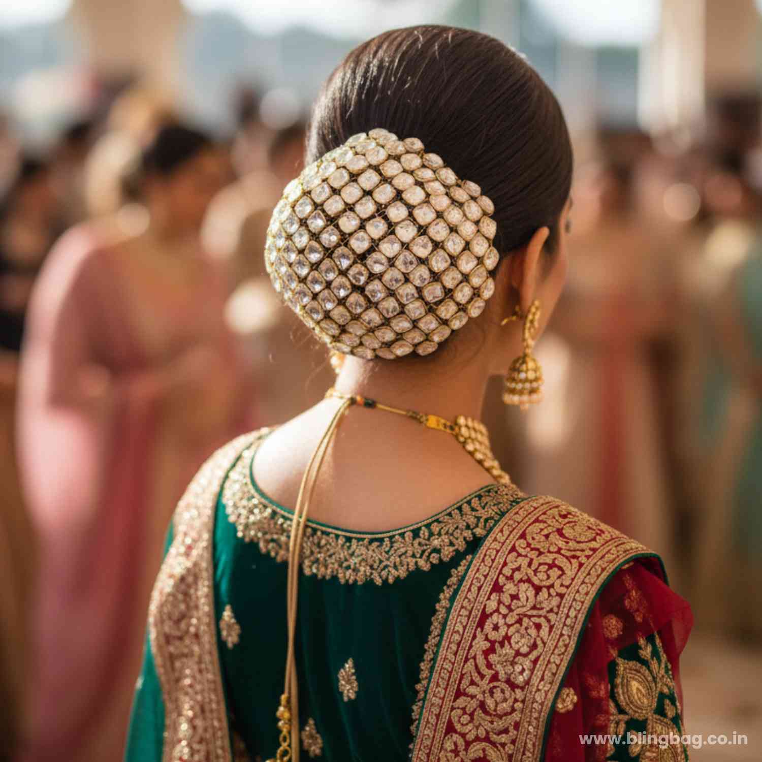 This stunning hair bun cage is adorned with square-cut kundan stones in a rich gold-tone finish, creating a glamorous and elegant look. Its dome-shaped design adds a royal charm to any hairstyle.