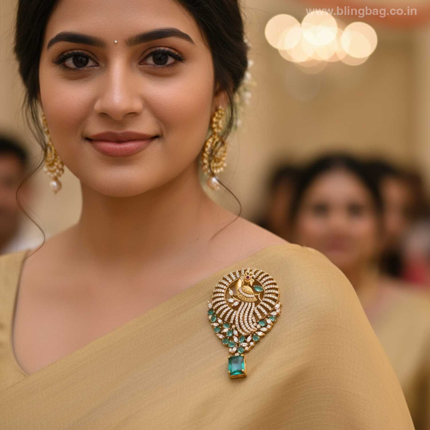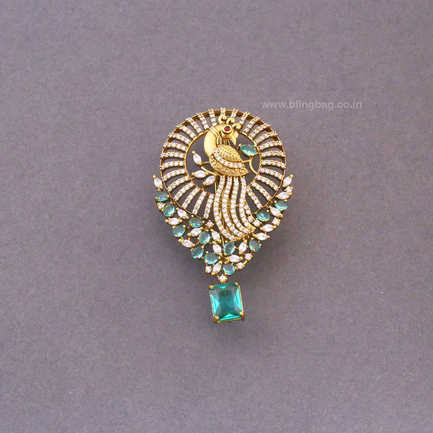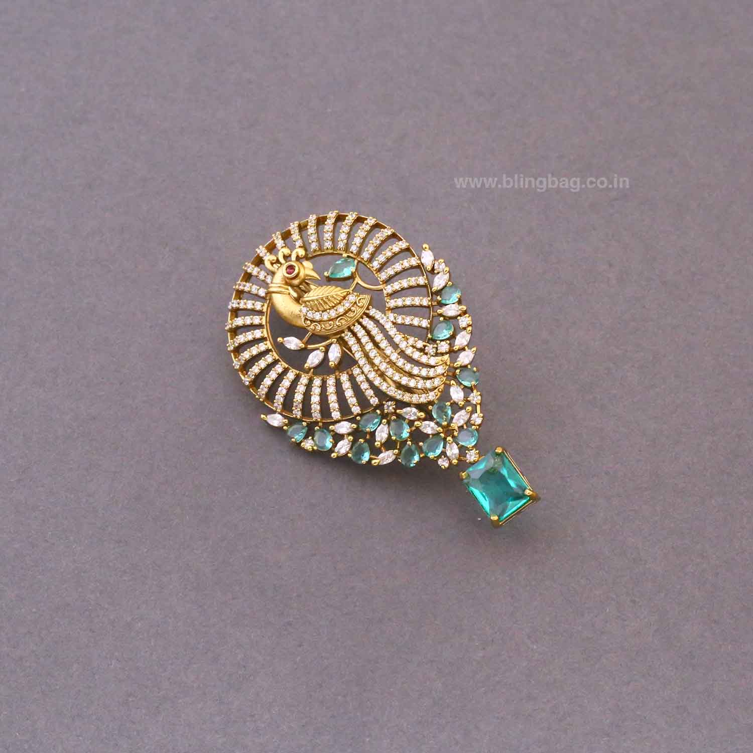Pin this to the shoulder of a mint green, cream, or gold silk saree. The dangling stone will catch the light perfectly against the rich fabric.