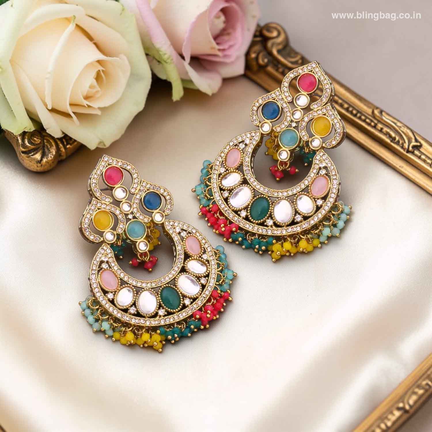 These elegant chandbali earrings showcase a beautiful blend of glossy and sparkling crystal accents set in a rich gold-toned finish. The intricate crescent design with delicate bead drops adds a graceful festive charm.