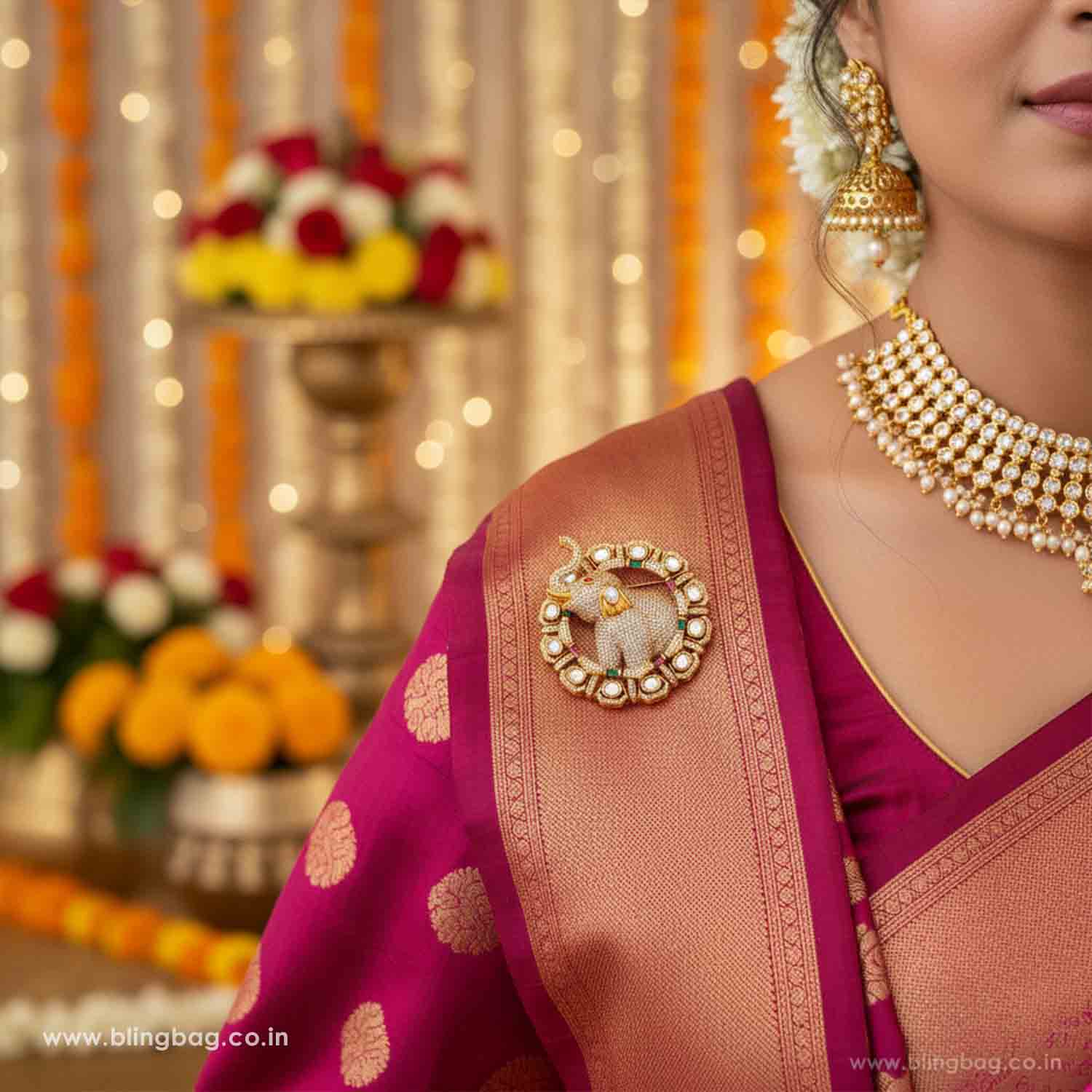 Style this brooch on a silk saree, dupatta, or festive jacket to elevate your ethnic look, or pin it on a clutch for a statement accessory at weddings and celebrations.
