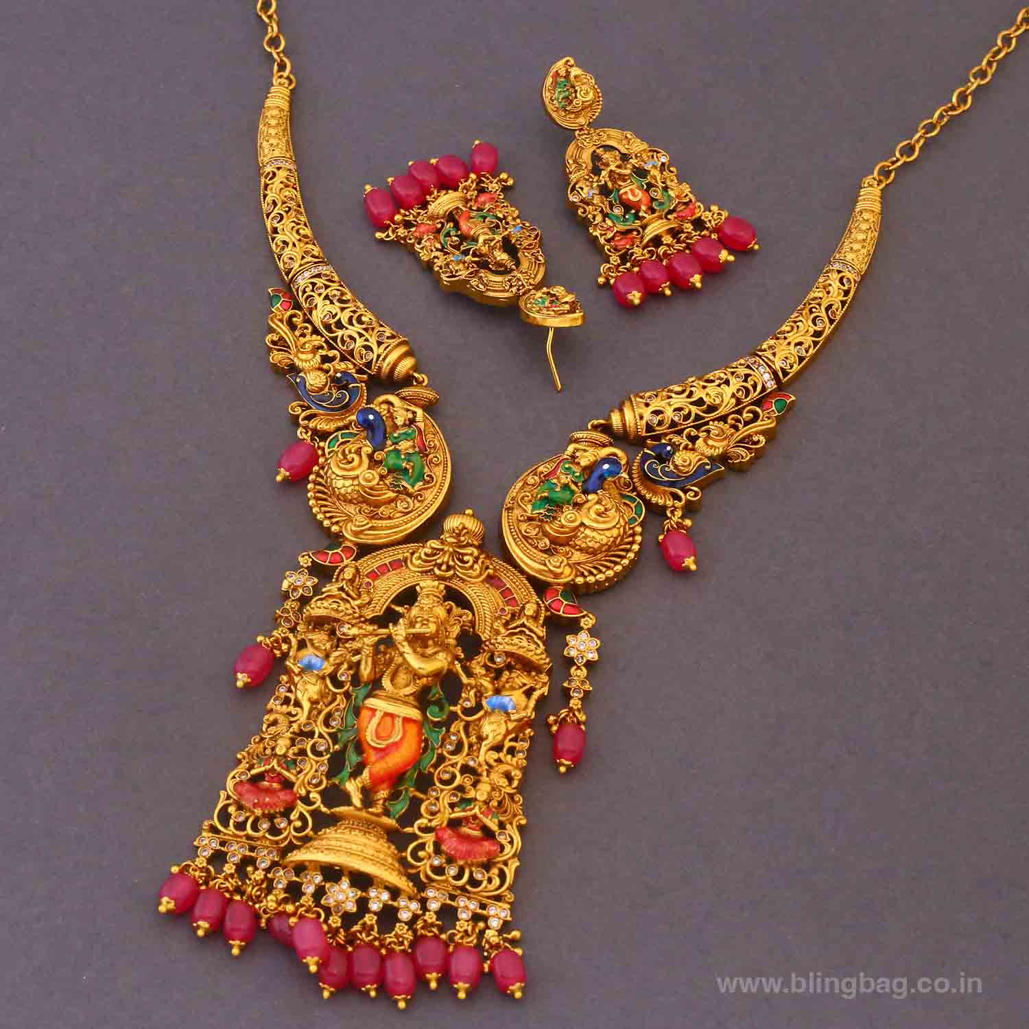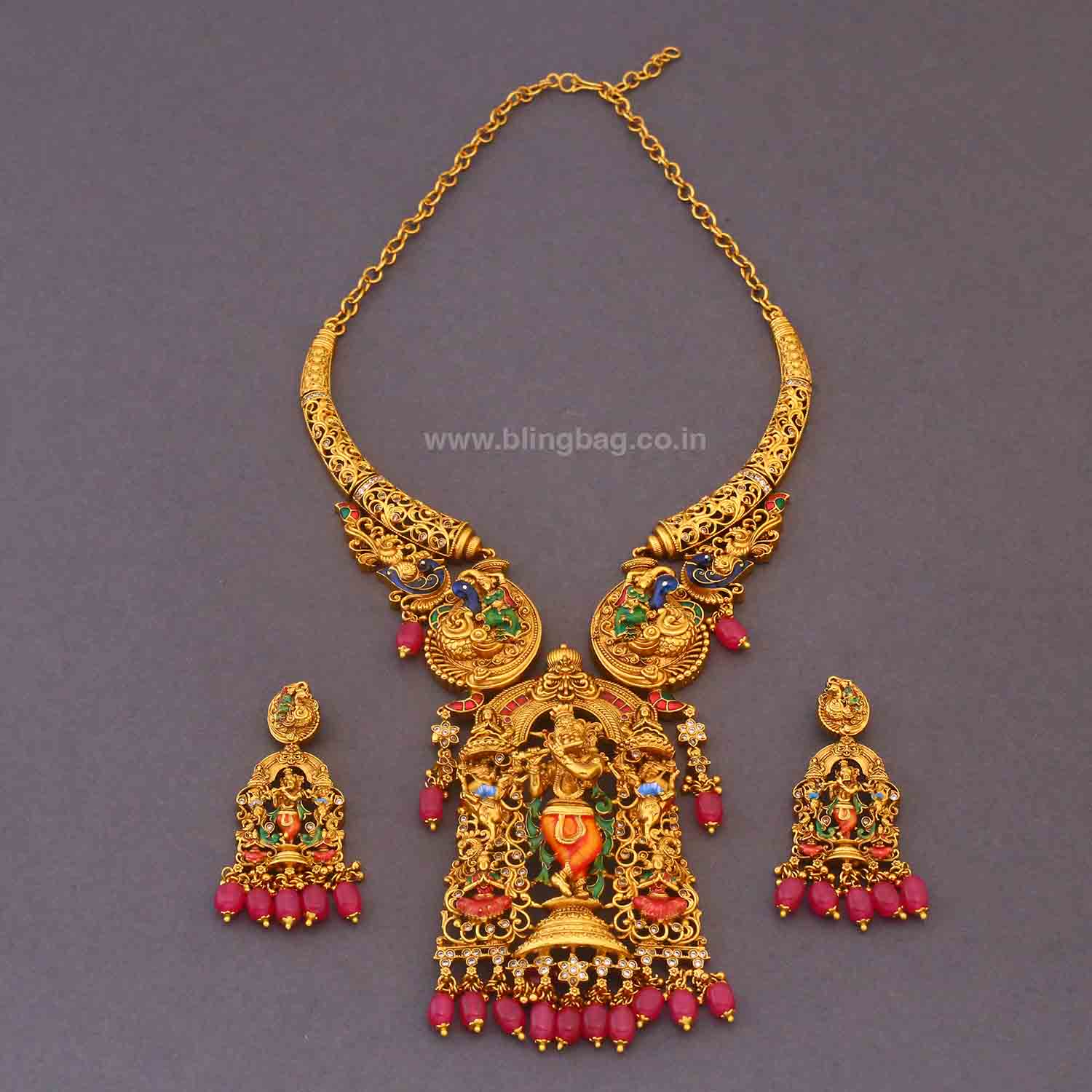 This stunning Govind temple jewellery set features an intricately crafted deity pendant with vibrant multicolor enamel work and rich antique gold finish. Accented with ruby-red beads, it adds a majestic and traditional charm to your look.