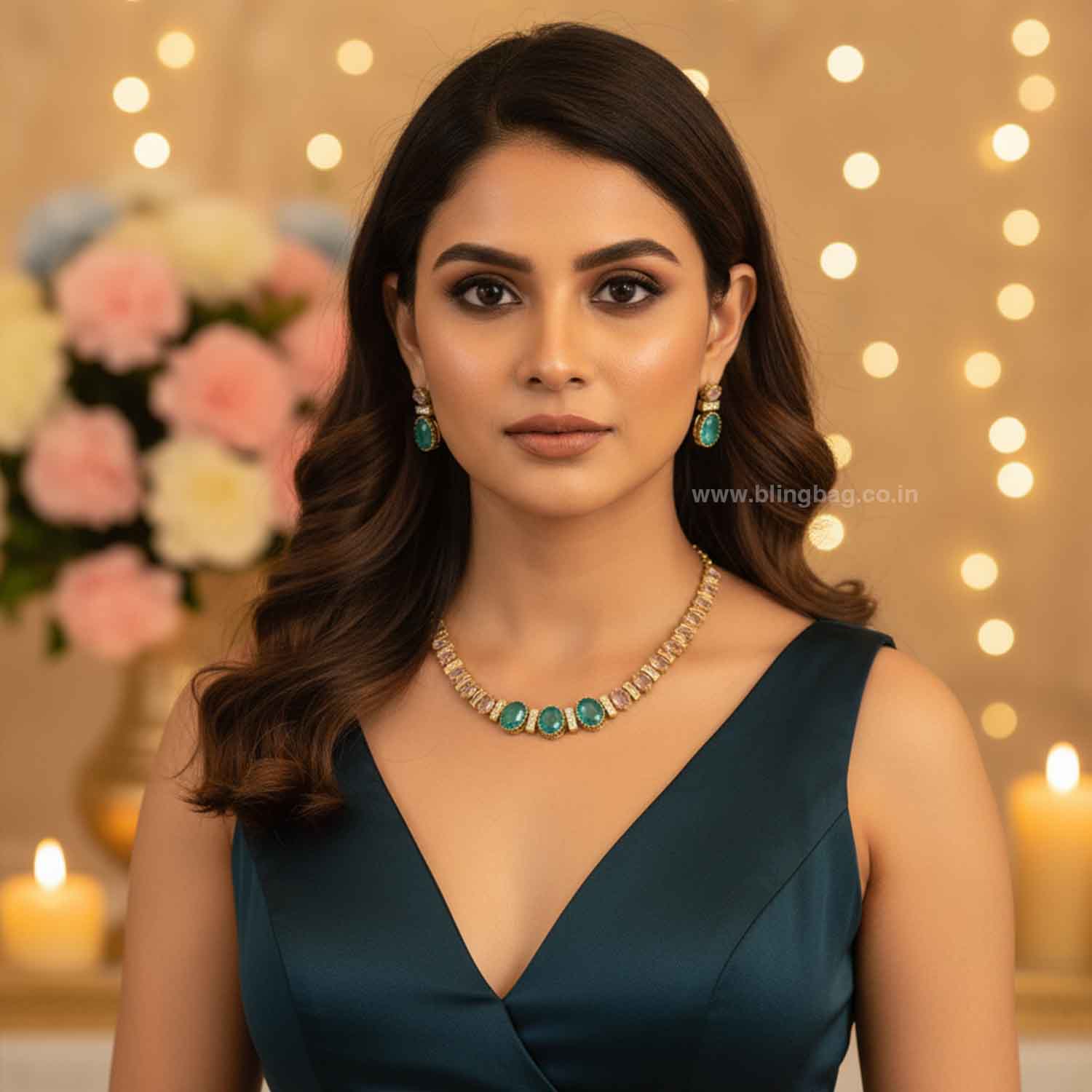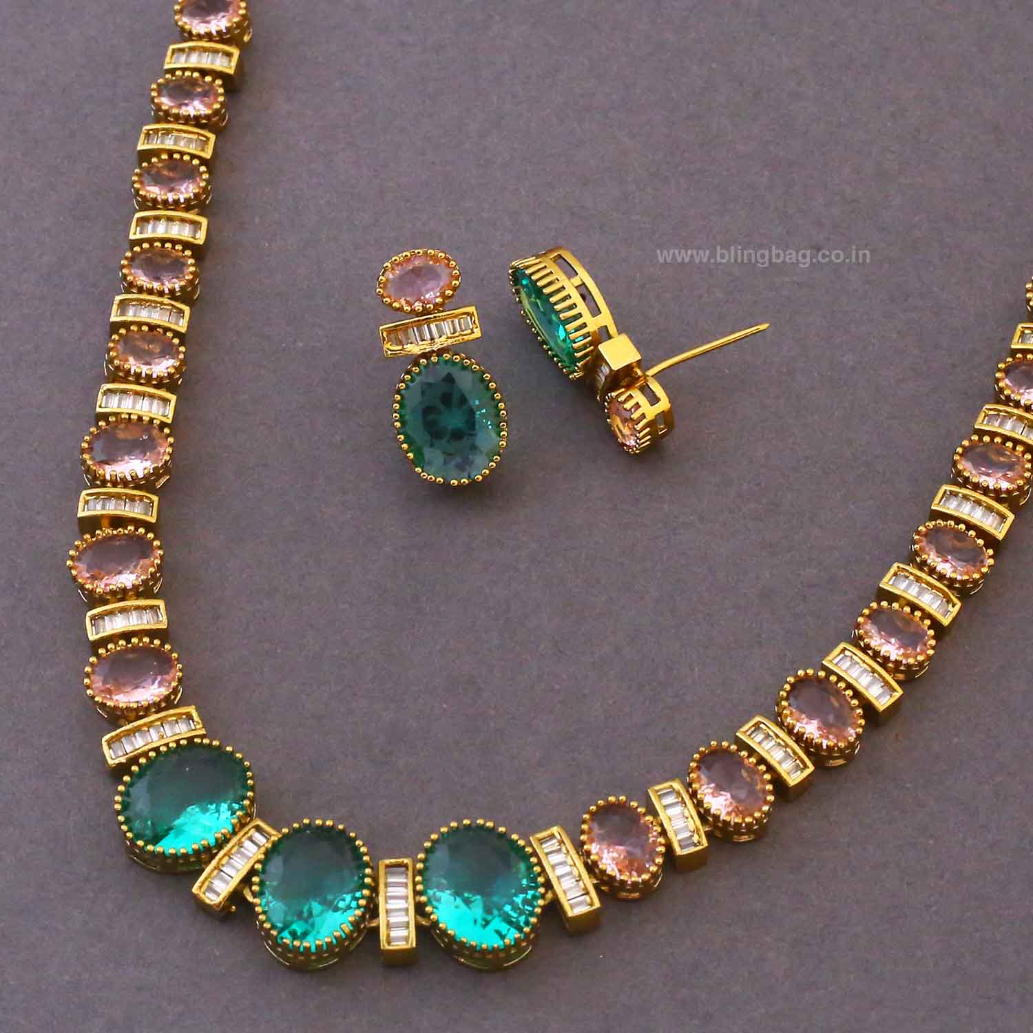 Elegant Victorian-style necklace set crafted with oval-cut stones and delicate detailing, paired with matching stud earrings. A refined design that beautifully blends classic charm with modern sophistication.