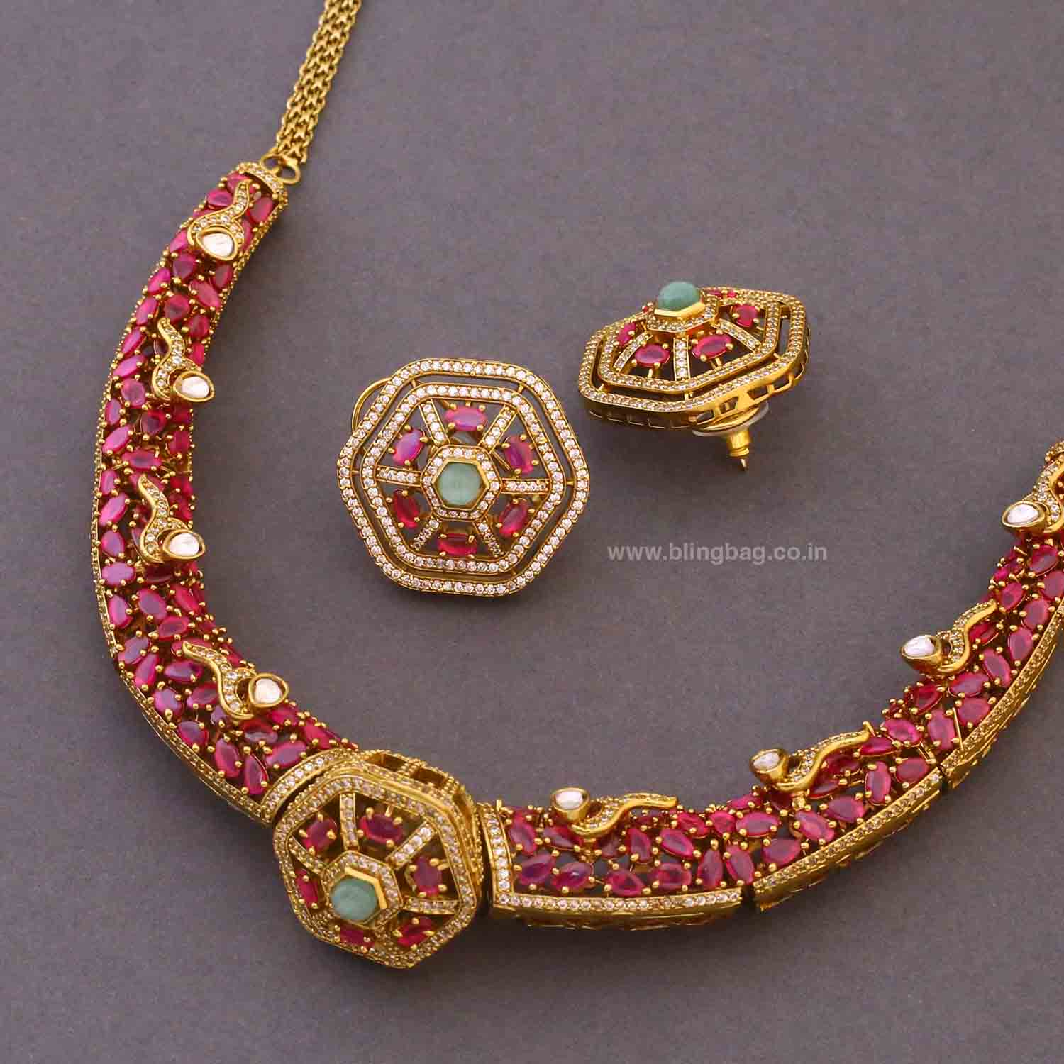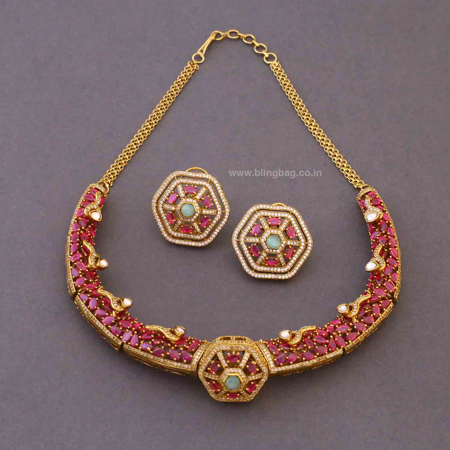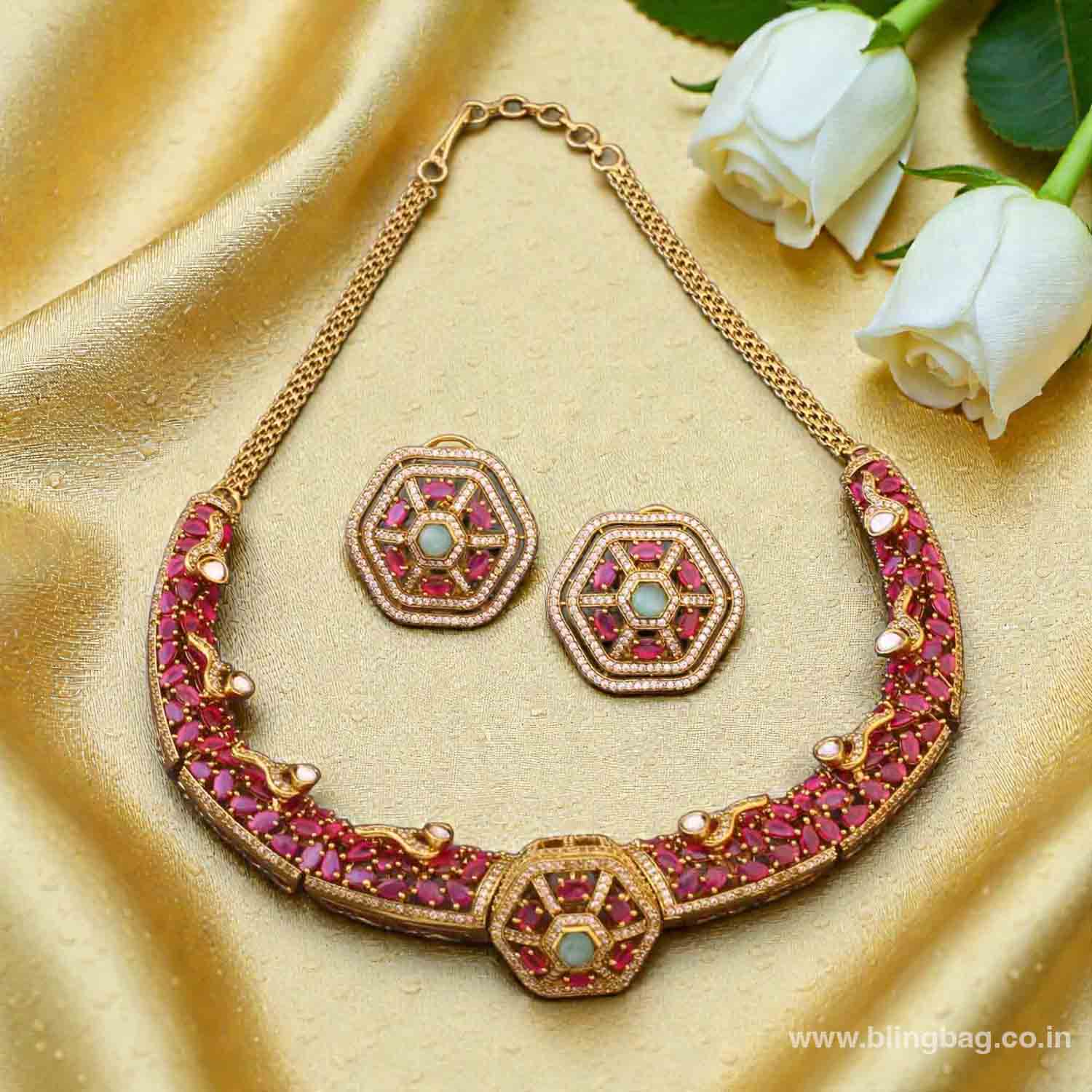This elegant Victorian-style necklace set features geometric stone detailing with intricate craftsmanship and delicate hanging accents. The matching earrings complete the look with a rich, traditional finish.
