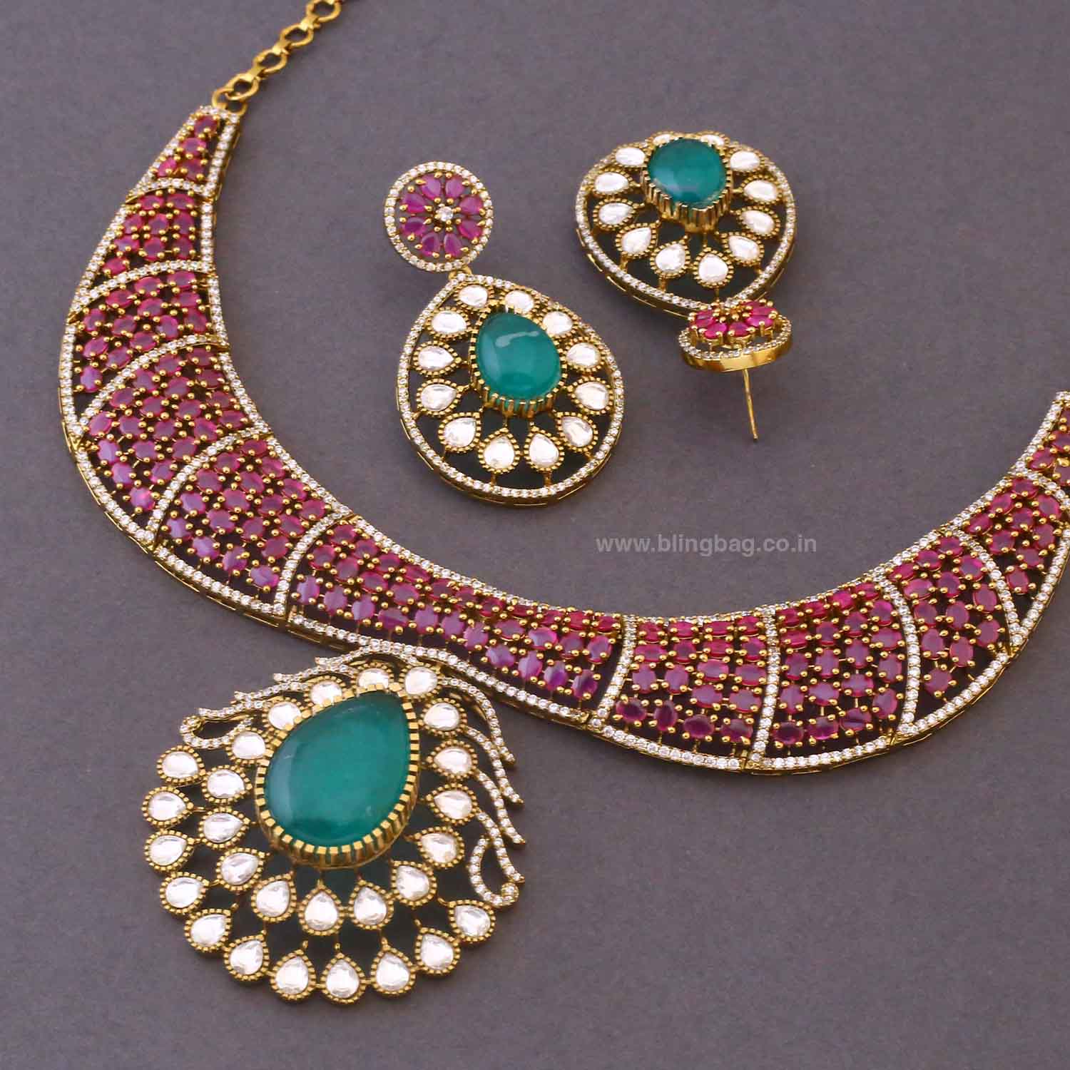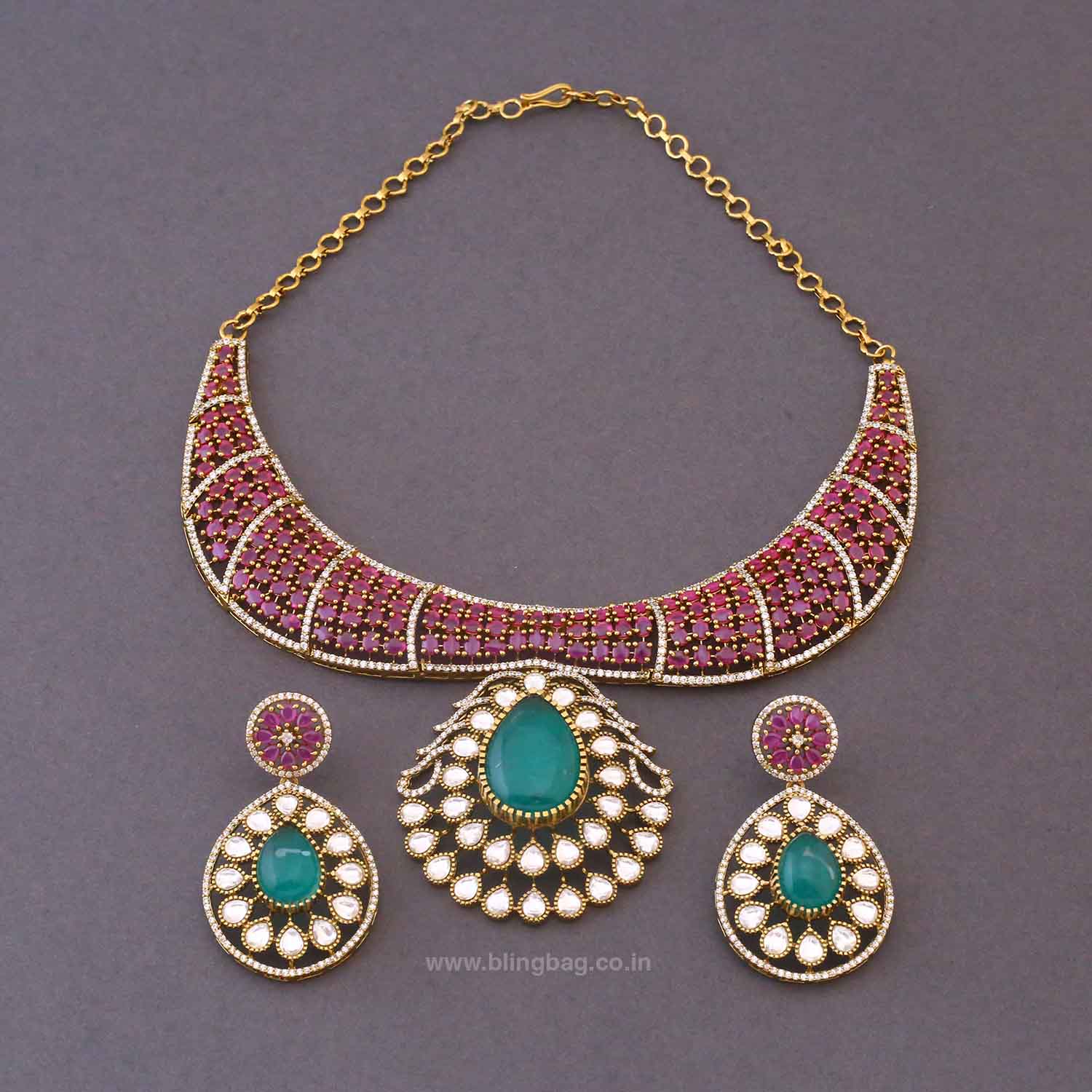 Elegant Victorian-style jewellery set featuring rich ruby tones with a bold emerald-green center stone, detailed with pearl and CZ accents for a royal finish.