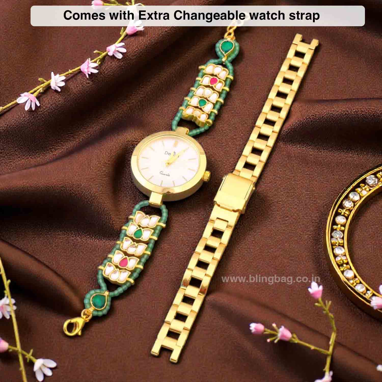 This stylish gold-toned bracelet watch is adorned with elegant kundan-style floral motifs and green bead detailing, giving it a rich traditional look. With an extra interchangeable metal strap, it offers versatile styling for both festive and everyday wear.