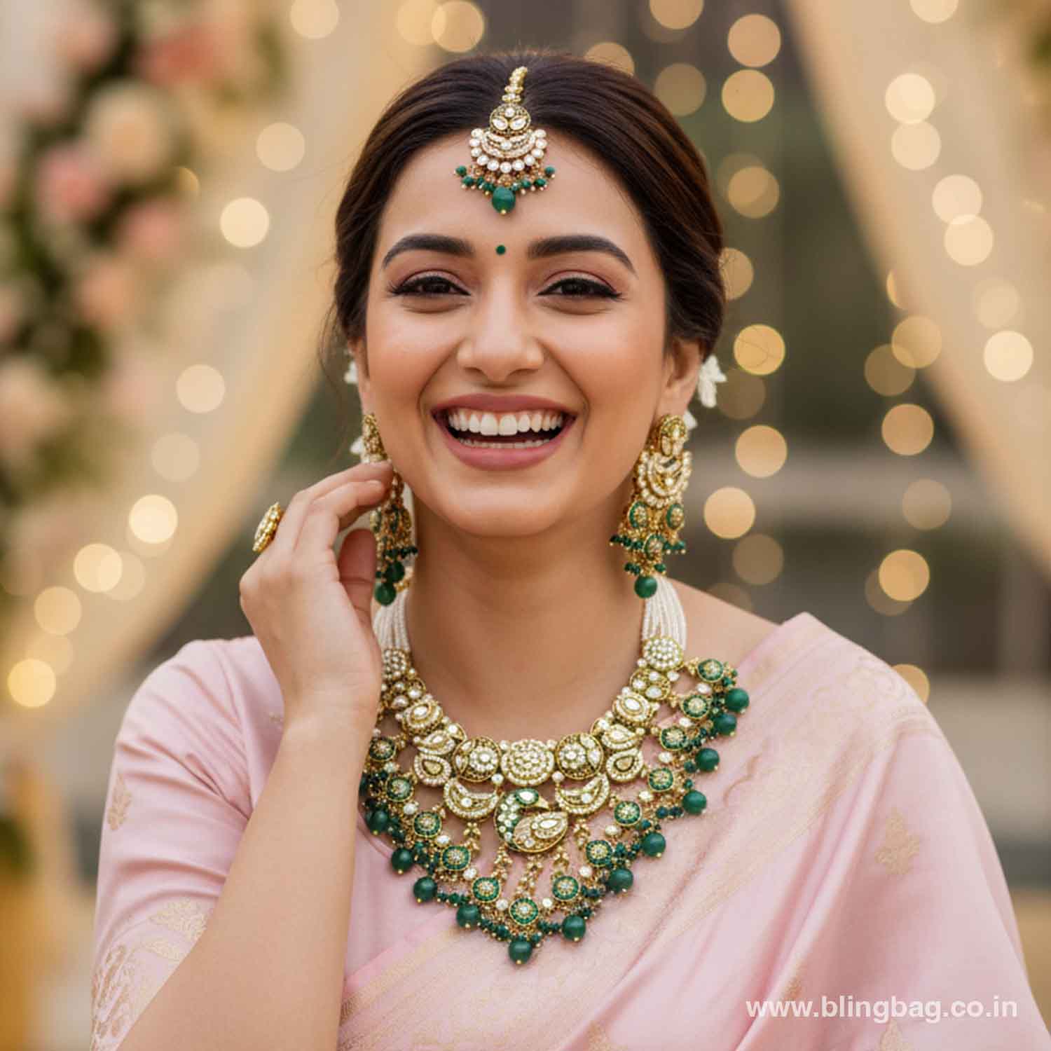 Pair this set with a richly embroidered saree, lehenga, or traditional silk outfit for weddings, festive events, or cultural functions to achieve a graceful and polished look.