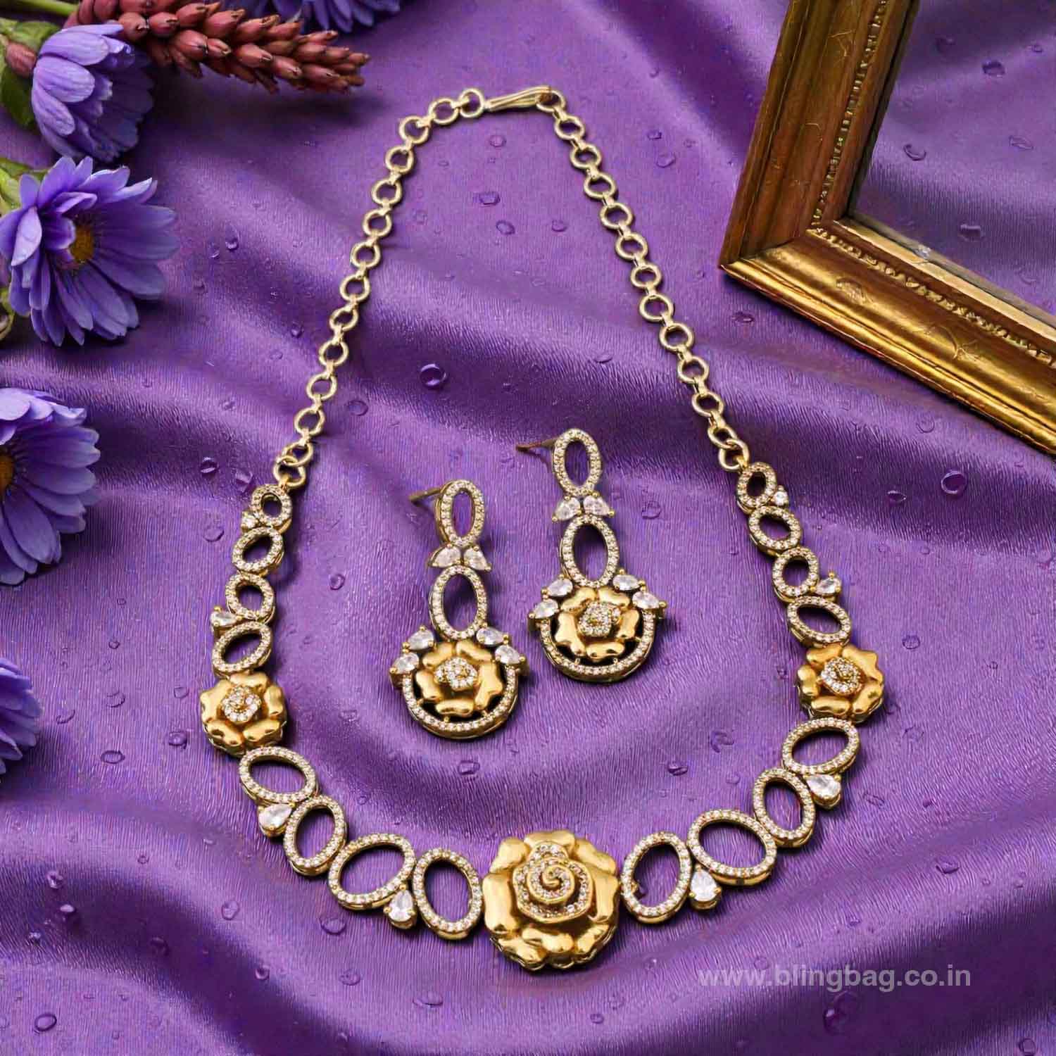 This elegant jewellery set features a graceful floral-inspired design with detailed stone setting and cascading elements. The beautifully crafted necklace and matching earrings create a sophisticated and timeless look for special occasions.