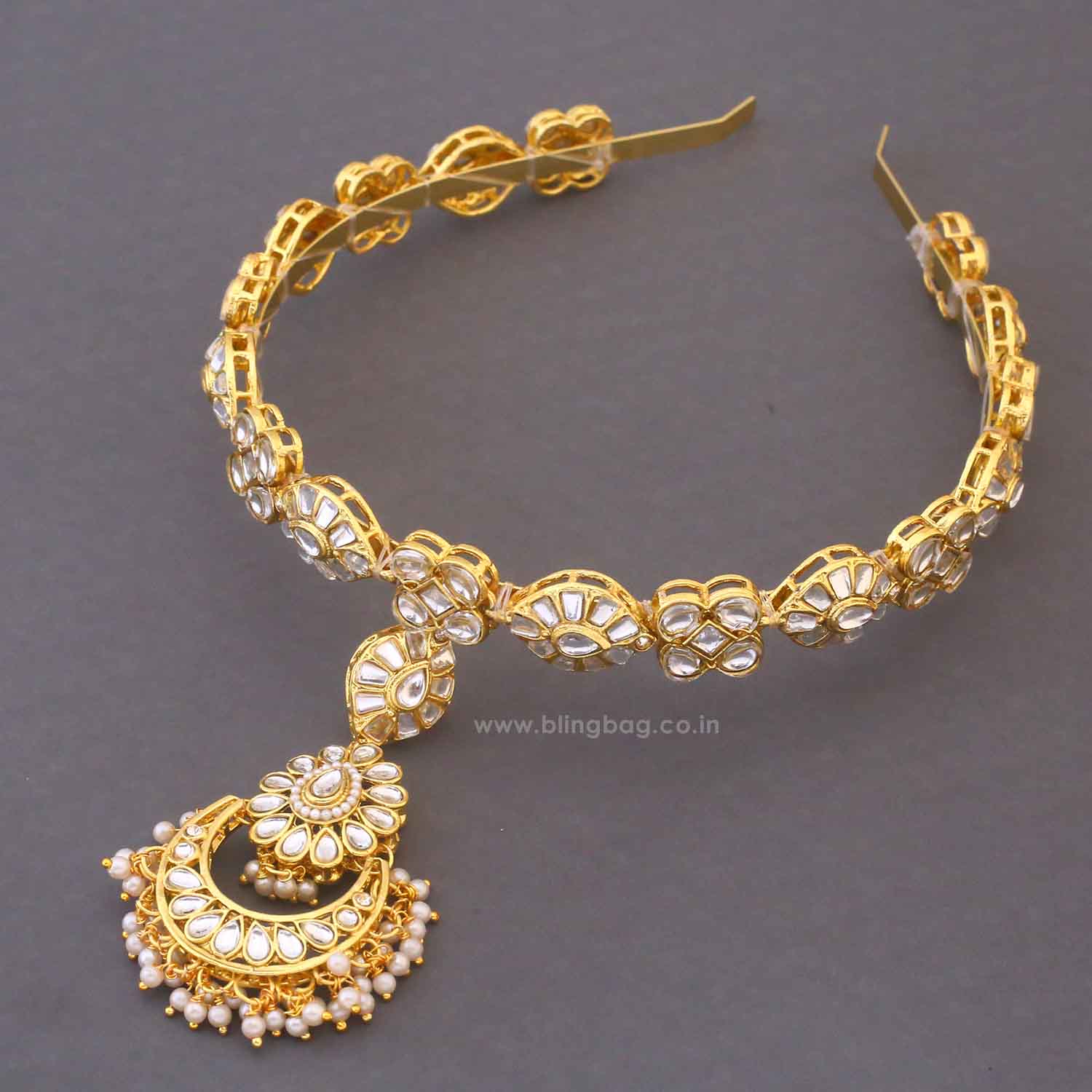 Designed to exude royal elegance, this headband with a tikka is a fusion of traditional charm and modern aesthetics. Adorned with intricate details, it gracefully complements bridal and festive looks, making it an essential accessory for grand occasions.