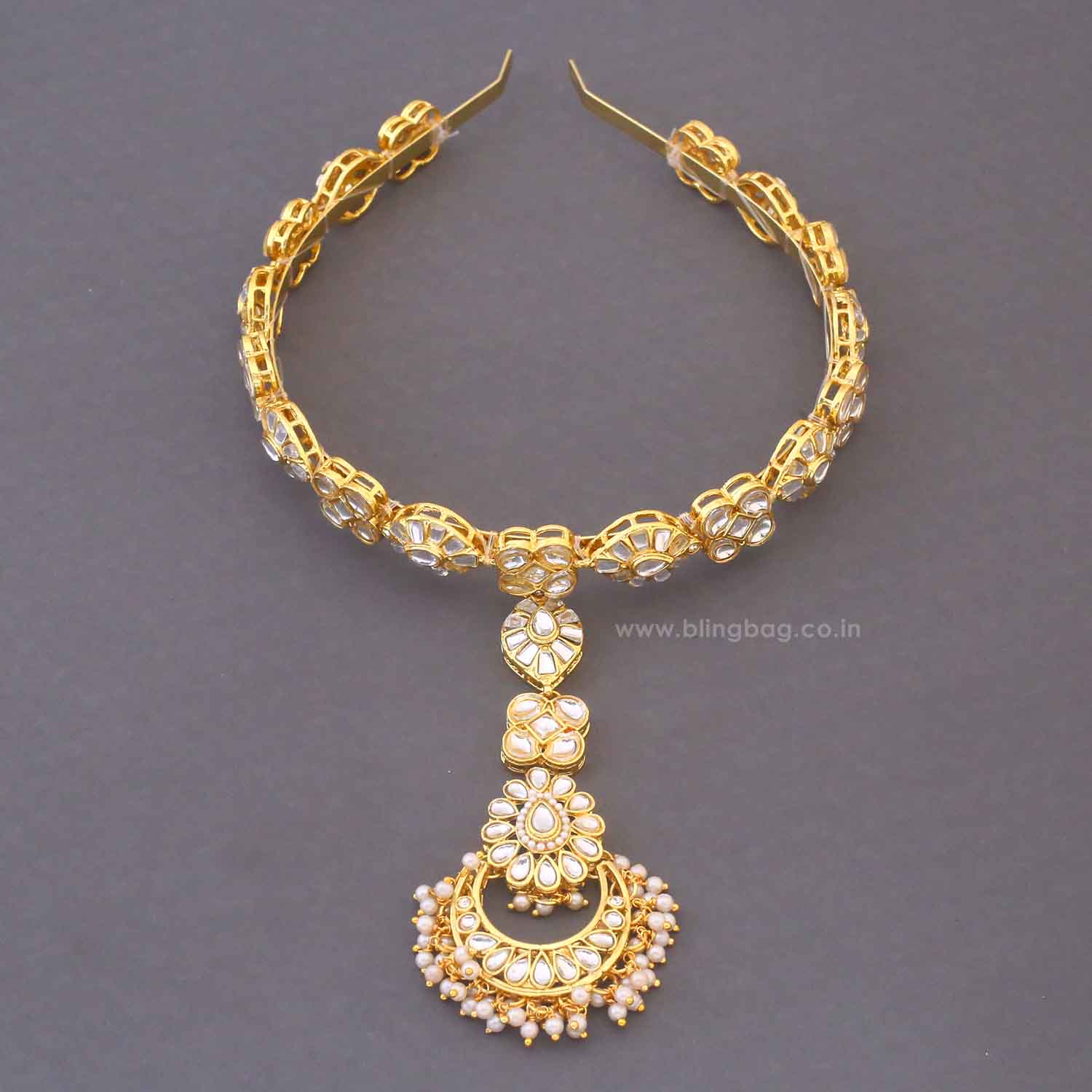 Designed to exude royal elegance, this headband with a tikka is a fusion of traditional charm and modern aesthetics. Adorned with intricate details, it gracefully complements bridal and festive looks, making it an essential accessory for grand occasions.