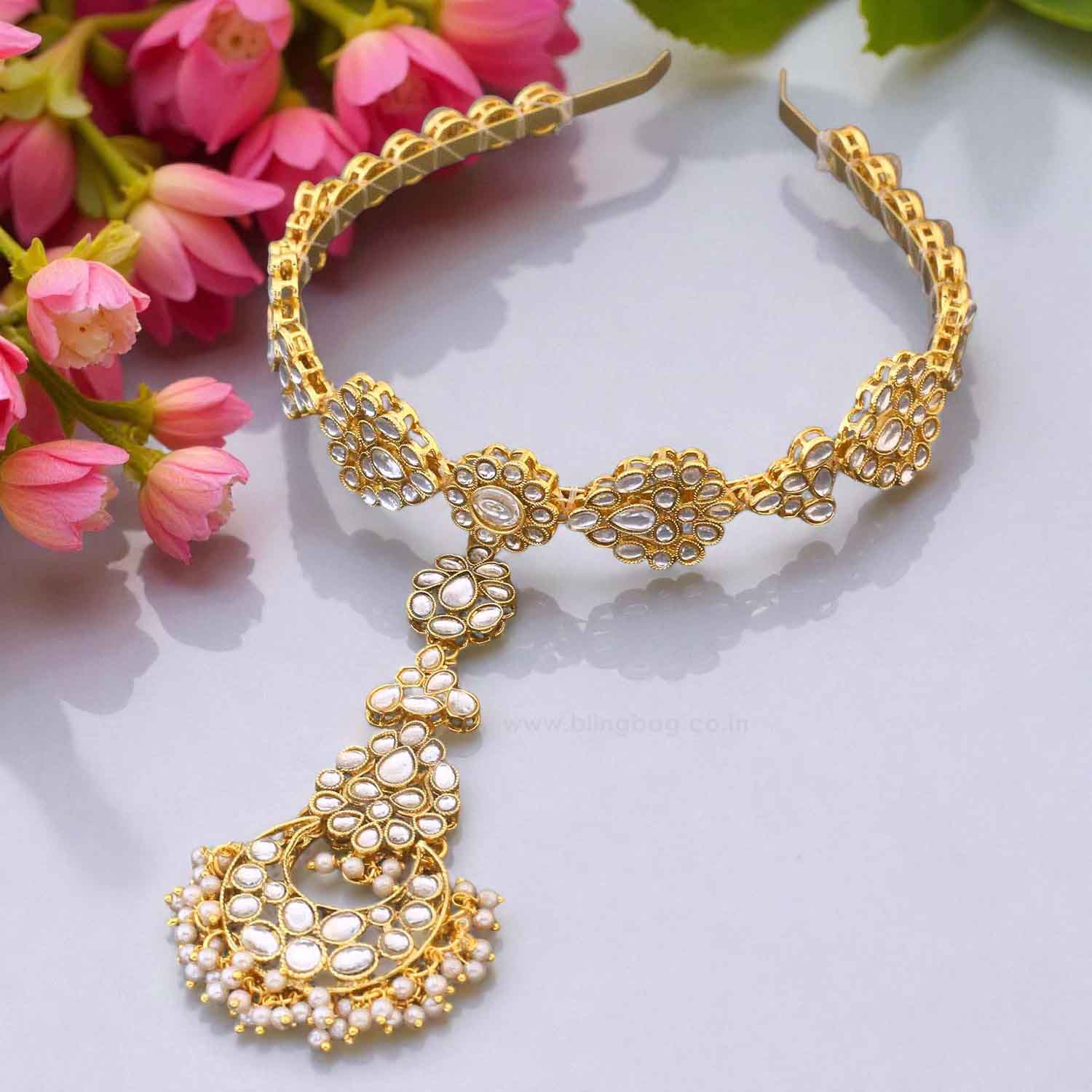 Designed to exude royal elegance, this headband with a tikka is a fusion of traditional charm and modern aesthetics. Adorned with intricate details, it gracefully complements bridal and festive looks, making it an essential accessory for grand occasions.