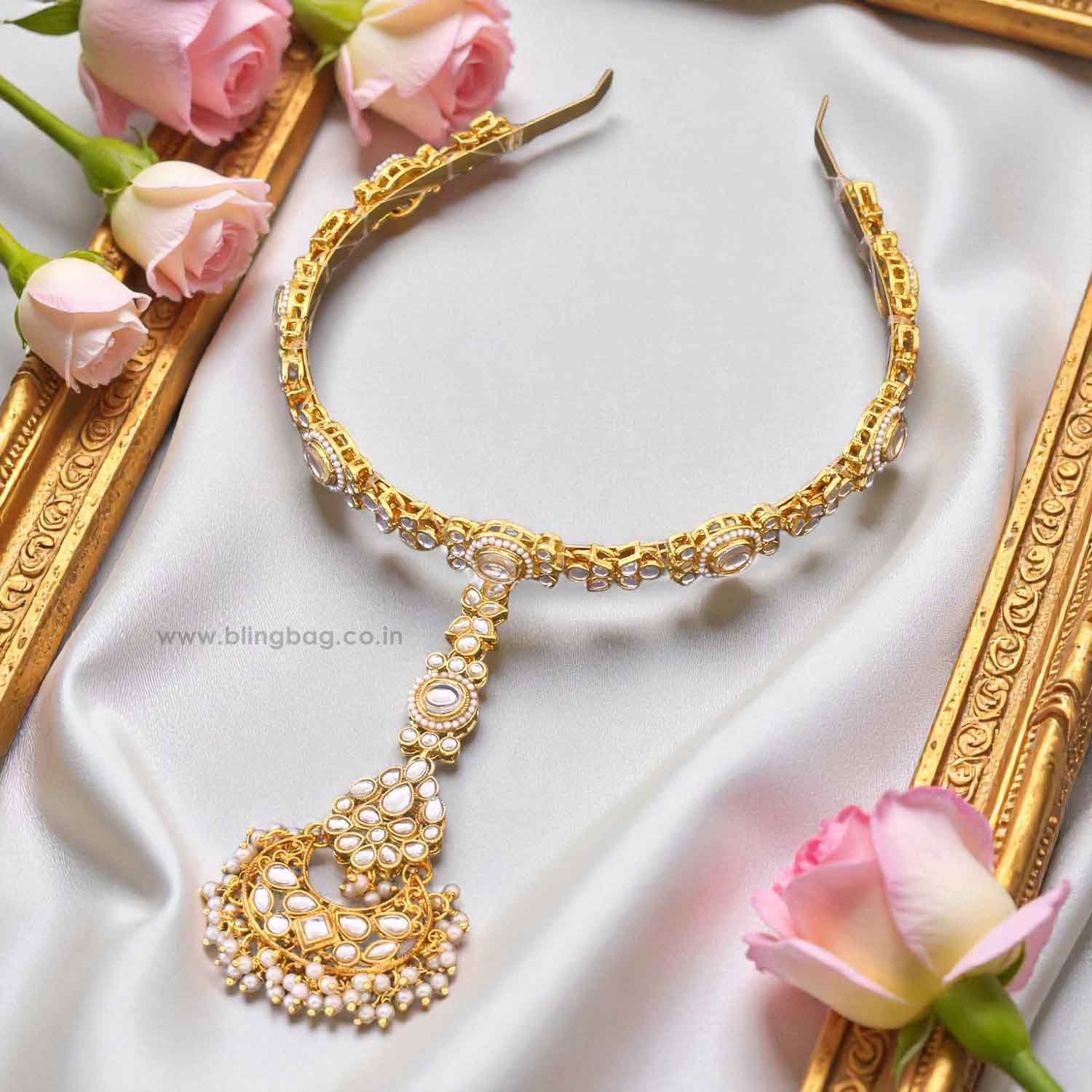 Designed to exude royal elegance, this headband with a tikka is a fusion of traditional charm and modern aesthetics. Adorned with intricate details, it gracefully complements bridal and festive looks, making it an essential accessory for grand occasions.