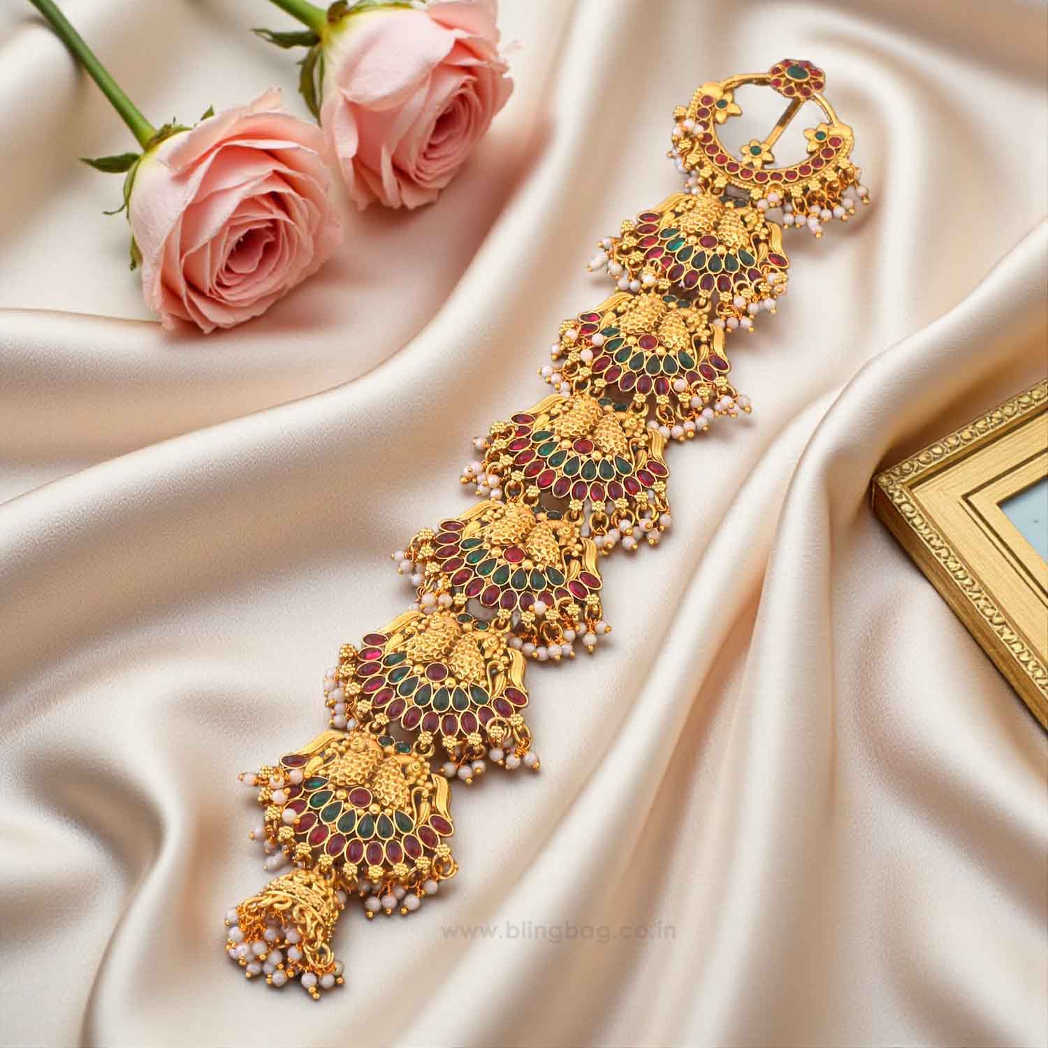 This elegant hair chooti is crafted with fine detailing and traditional motifs, making it a stunning accessory for festive and wedding occasions. Its versatile design adds a graceful charm to both traditional hairstyles and contemporary hairdos, making it a must-have addition to your accessory collection.