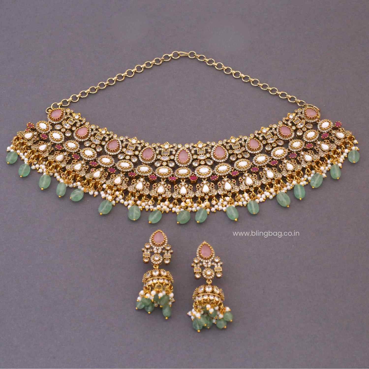 This graceful Victorian choker set showcases soft peach stones highlighted with sparkling crystals, pearl detailing, and refreshing green bead drops. The matching jhumka-style earrings complete the look with timeless elegance.
